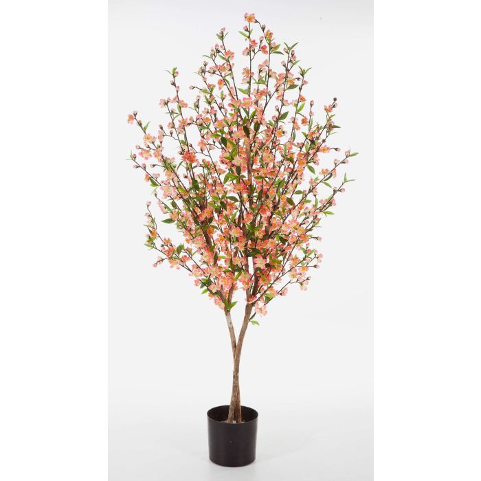 Der Kunststoff Baum ZADAR ist in einen schwarzen Topf gepflanzt und ca. 140 cm groß. Der künstliche Baum hat weiß-orange-rosa Blüten, grüne Blätter und einen braunen Naturstamm.
