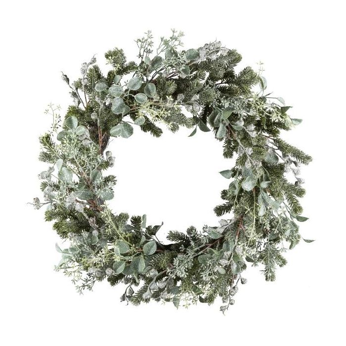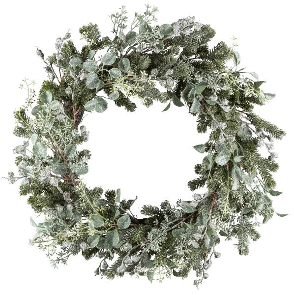 Künstlicher Kranz Eukalyptus, Tanne DUVRA mit Blüten, gefroren, grün-grau, Ø60cm