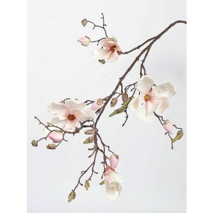 Fein gearbeiteter Deko Magnolie-Zweig LORA mit 4 offenen Blüten und 23 Knospen in Blütenfarbe: creme-rosa. Der Kunststil hat eine Länge von ca. 110 cm.