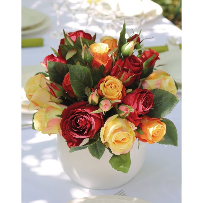 Schöner Deko Rosenstrauß Große-MOLLY in Blütenfarbe rot-orange-gelb zur eleganten Tischdekoration. Der künstliche Strauß mit verschieden großen Rosenblüten hat eine Höhe von ca. 30 cm und einen Außendurchmesser von ca. 25 cm.