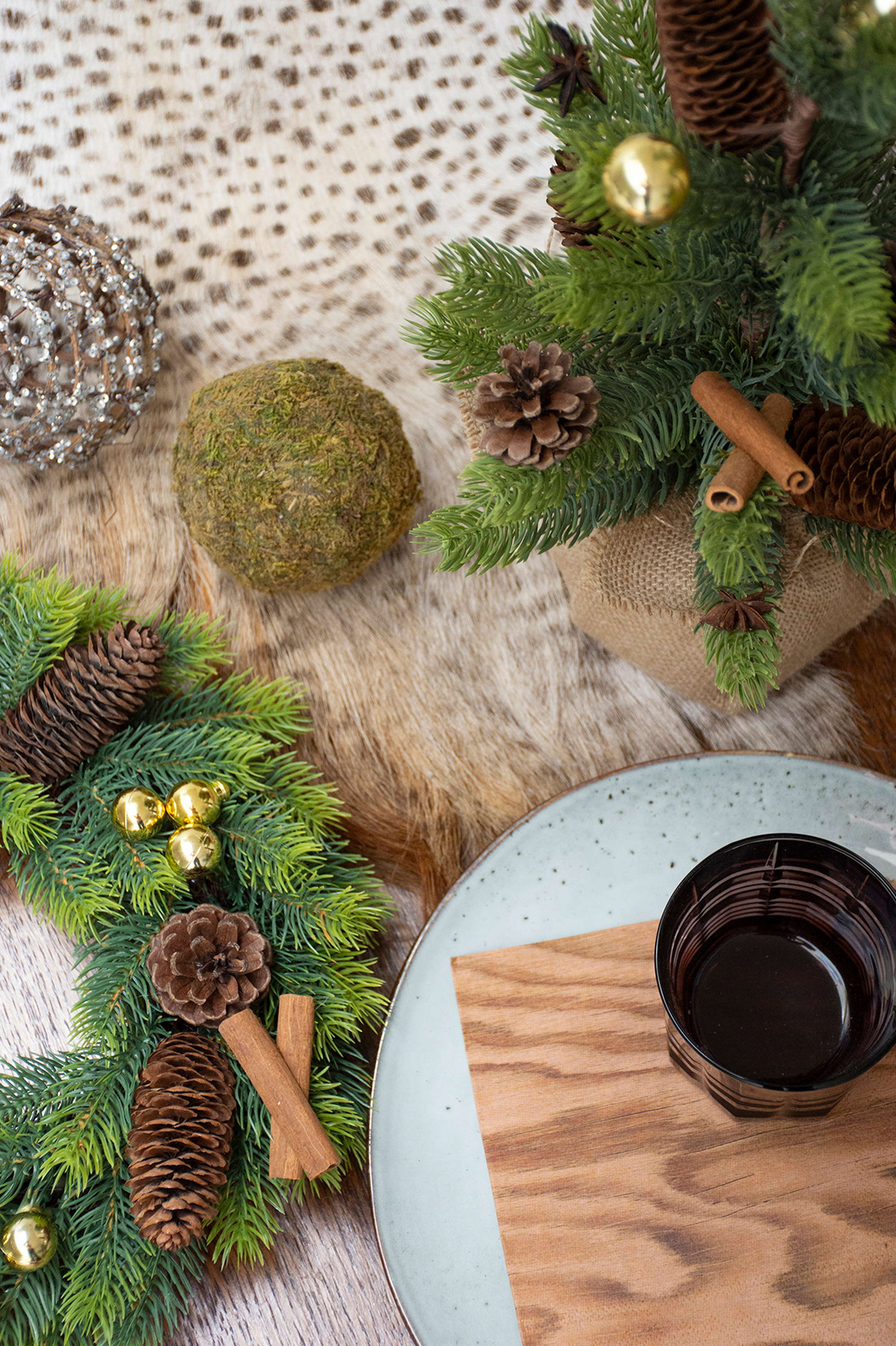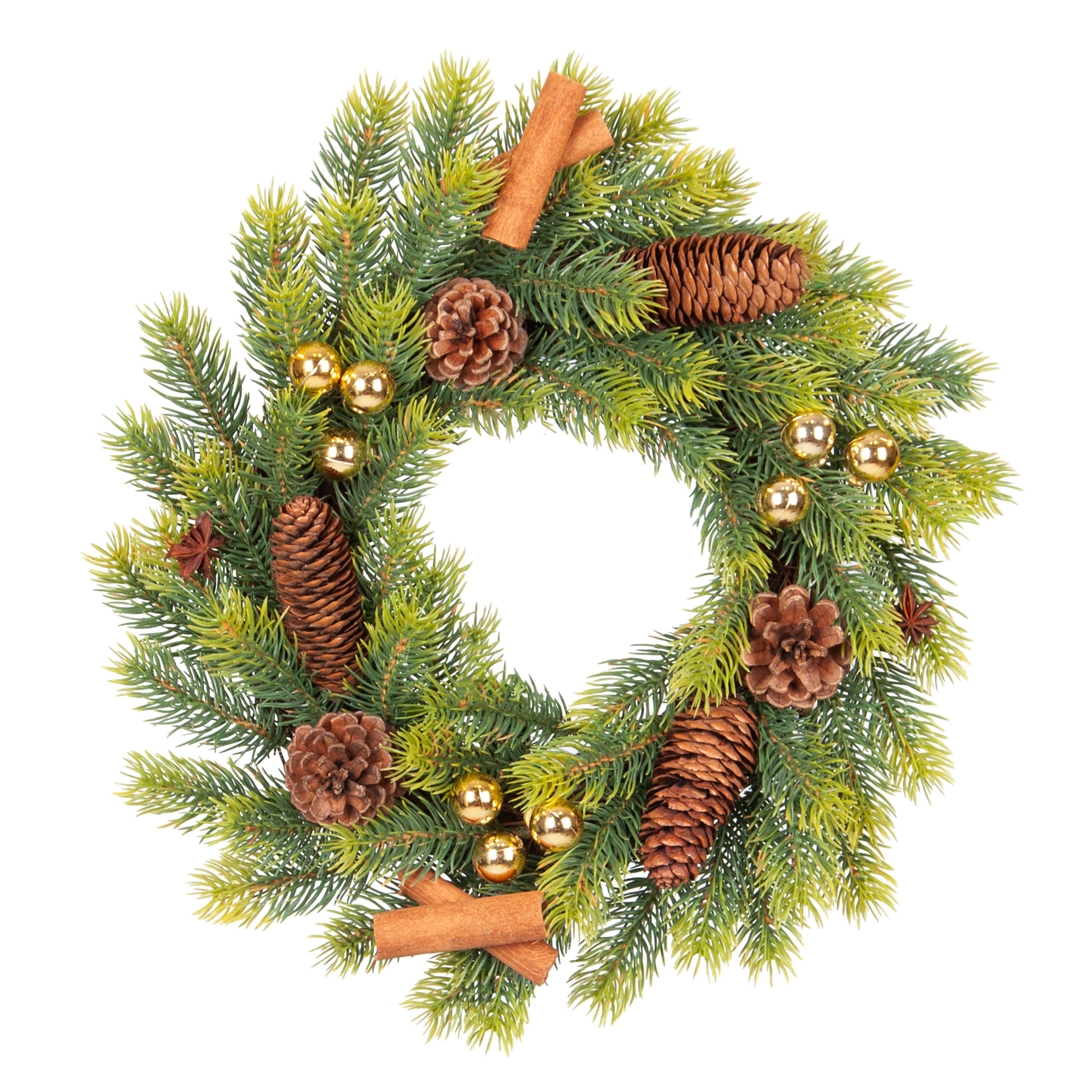 - Nadelzweige in grün, mit echten Zimtstangen und Zapfen und goldenen Kugeln