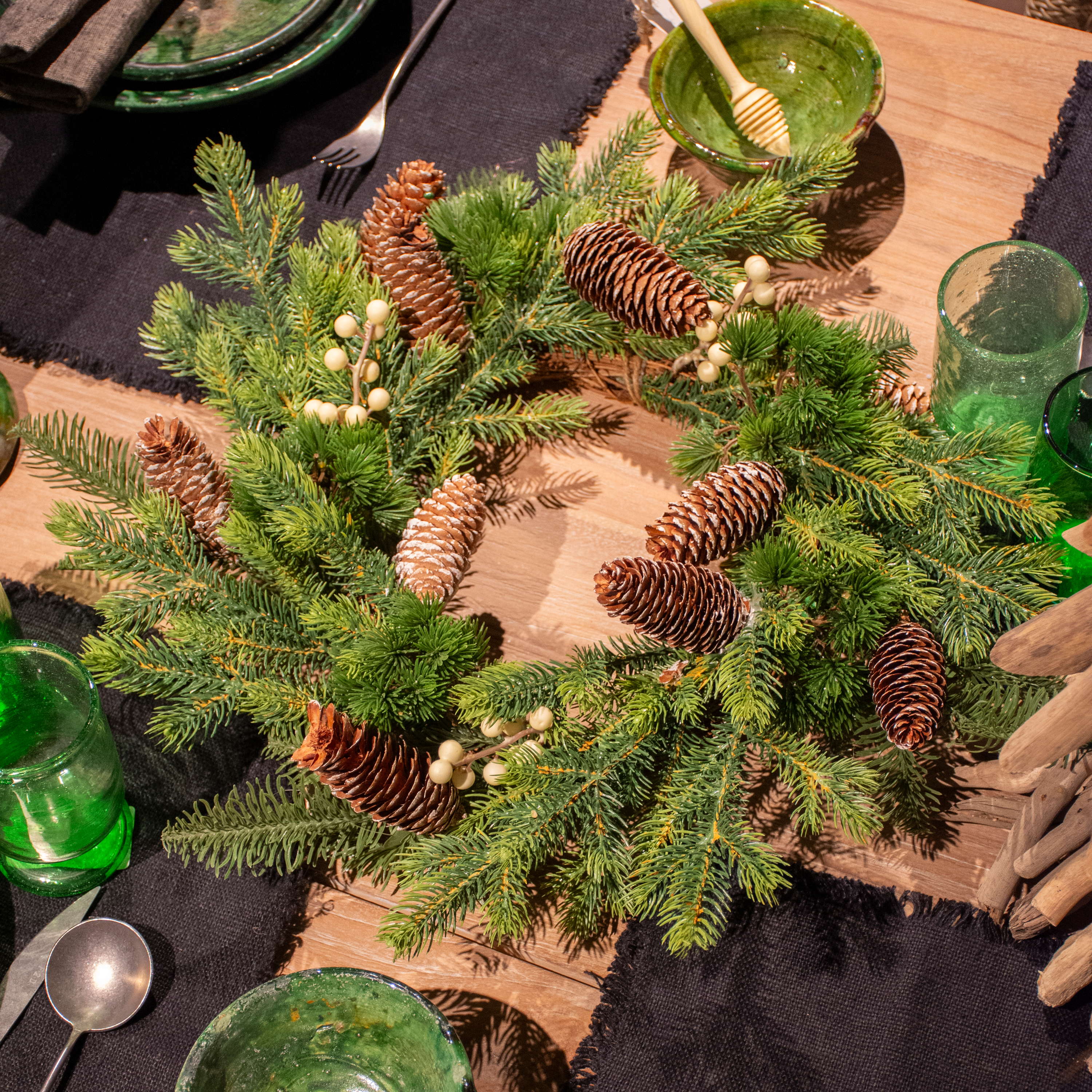 - Nadelzweige in grün, mit weißen Beeren und echten Zapfen