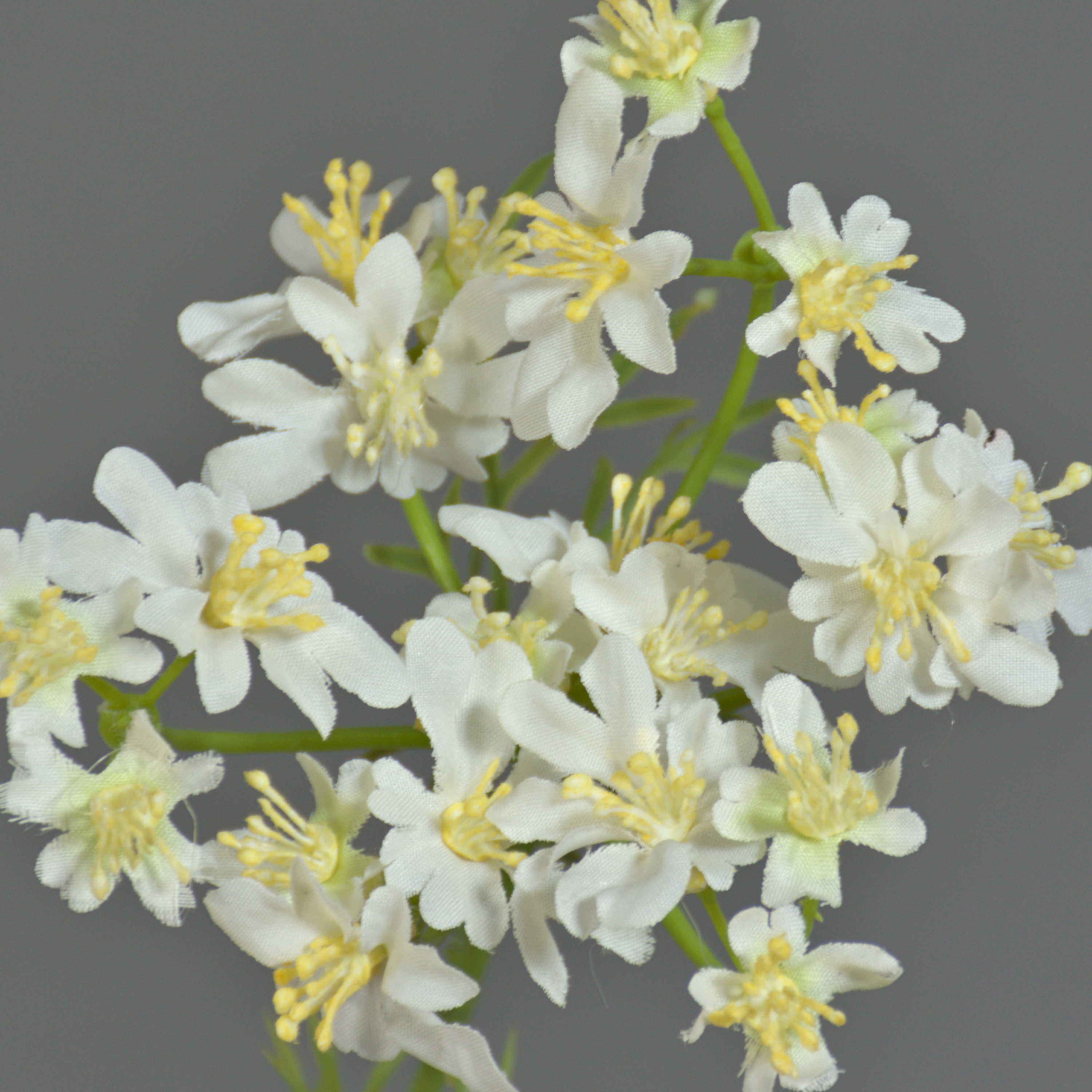 Der unechte Blütenzweig KALOMIRA in der Farbe weiß hat ein Gesamtmaß von ca. 85 cm und ist auf Stiel befestigt.