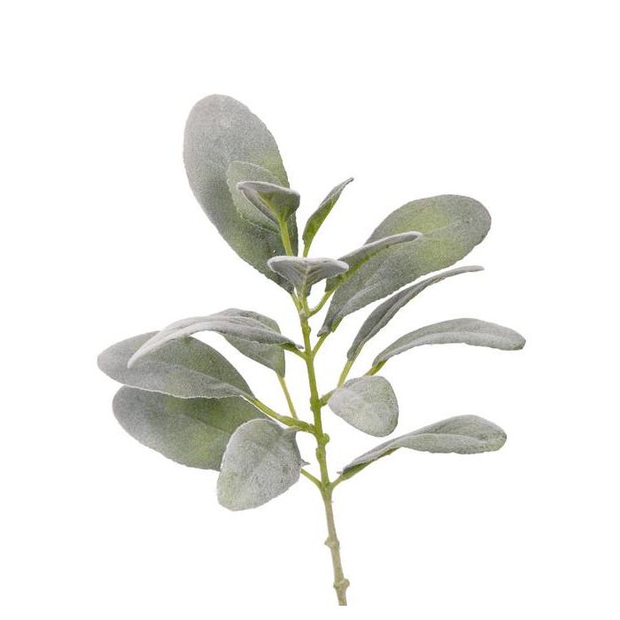 Kunstvoller flauschiger Zweig FERRIS mit ca. 15 Blättern. Der Wollartige Kunst-Zweig auch Eselsohr oder Hasenohr genannt, sticht besonders durch seine künstlich weiß schimmernde weiche Oberfläche hervor.