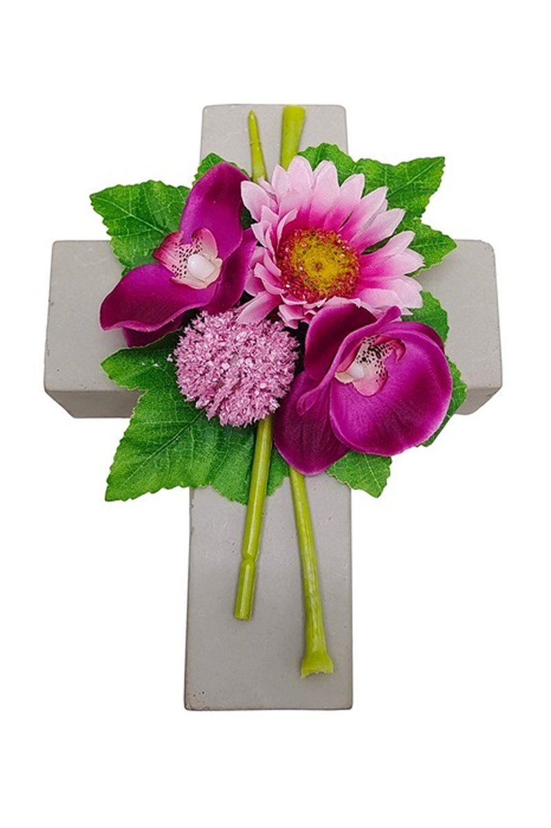 - Das geschmackvolle Blumengesteck auf einem Kreuz ist eine schöne Bereicherung z.B. für den Grabschmuck, bitte beachten Sie das wir für die Verwendung im Außenbereich keine Garantie auf die Langlebigkeit und Beständigkeit geben können, die Kunstblumen können sich durch die UV-Strahlung verfärben, brüchig werden oder durch Wind abreißen!