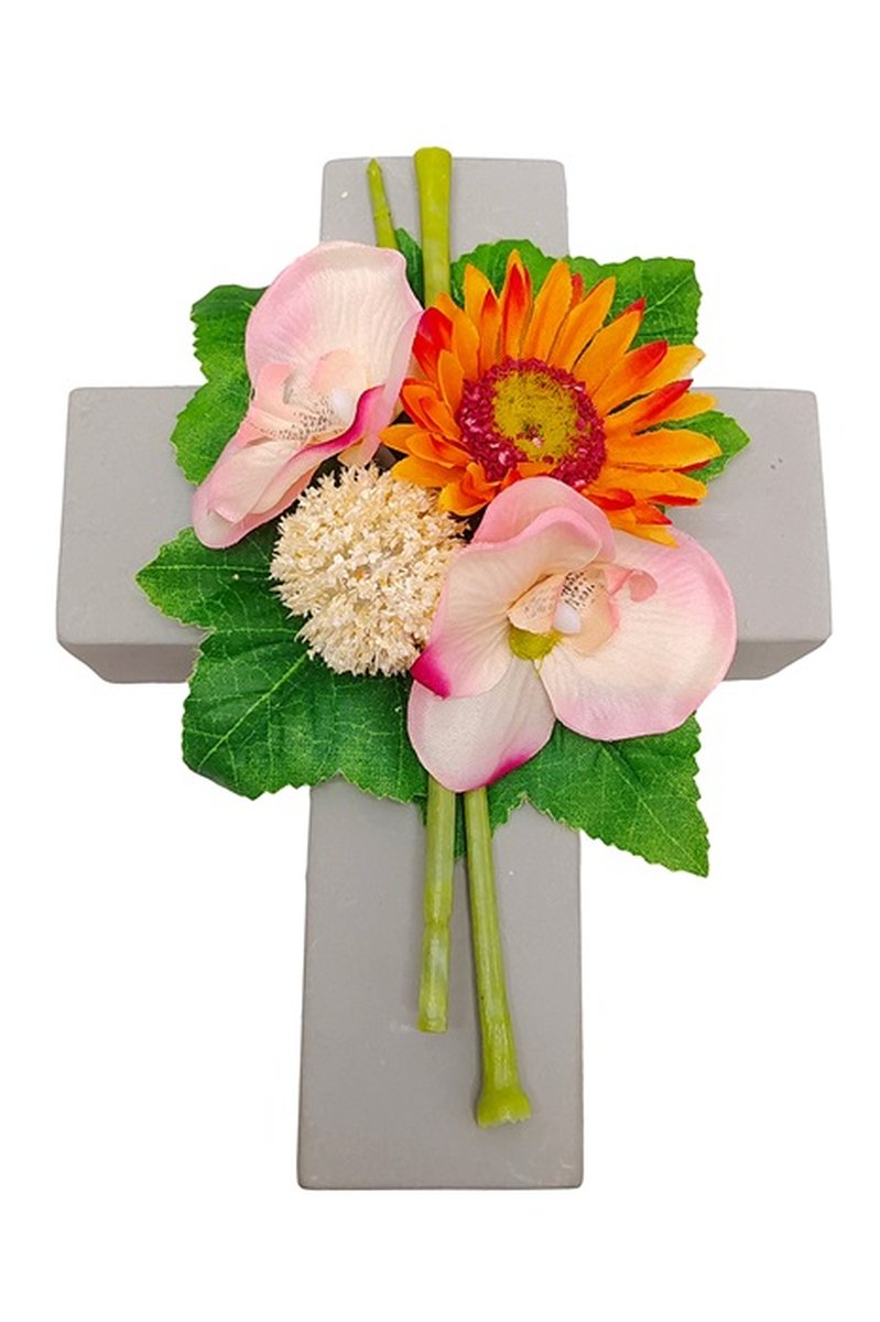 Künstliches Blumengesteck Gerbera, Orchidee, Allium ANSGAR, Pflanzkreuz, rosa-orange, 20x15x9cm