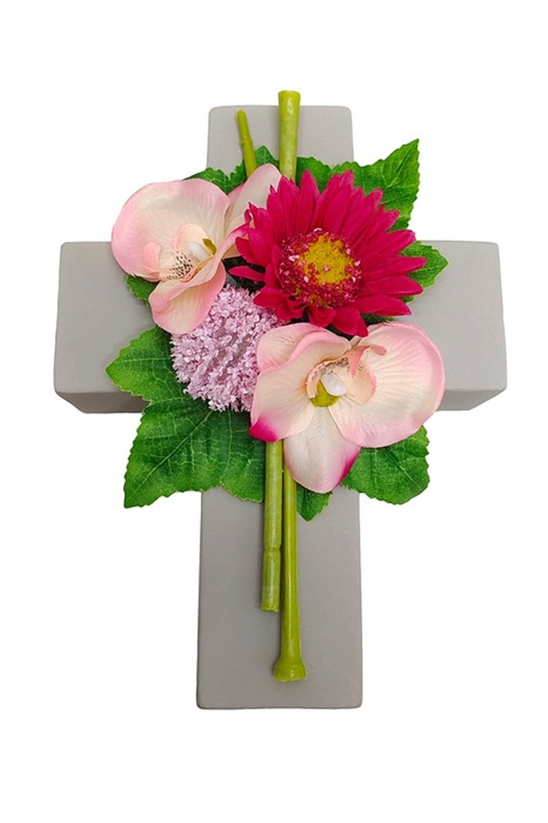 - Das geschmackvolle Blumengesteck auf einem Kreuz ist eine schöne Bereicherung z.B. für den Grabschmuck, bitte beachten Sie das wir für die Verwendung im Außenbereich keine Garantie auf die Langlebigkeit und Beständigkeit geben können, die Kunstblumen können sich durch die UV-Strahlung verfärben, brüchig werden oder durch Wind abreißen!