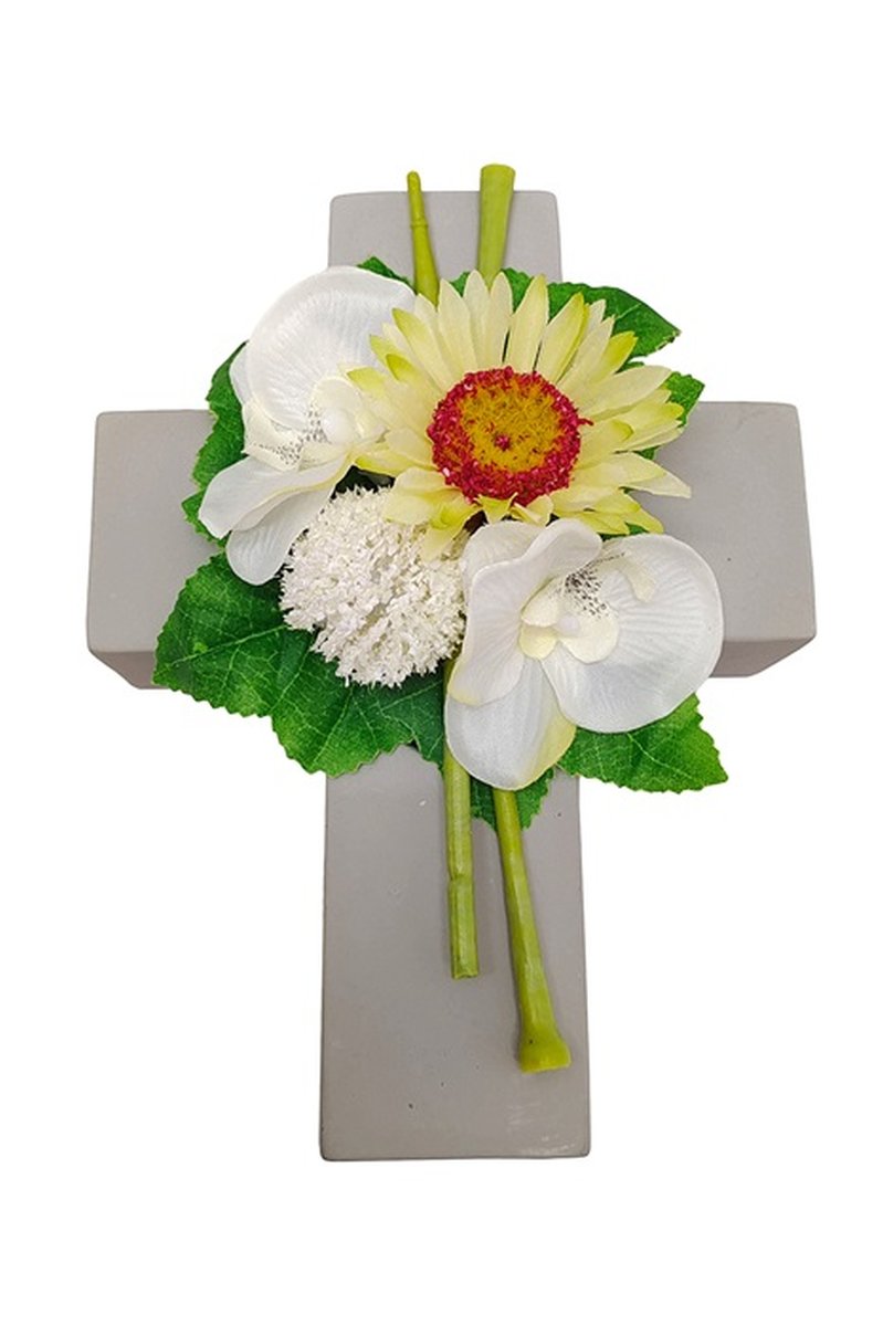 Künstliches Blumengesteck Gerbera, Orchidee, Allium ANSGAR, Pflanzkreuz, weiß-gelb, 20x15x9cm