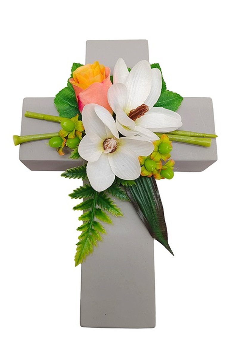 Künstliches Blumengesteck Magnolie, Rose, Johanniskraut TORVI, Pflanzkreuz, weiß-gelb-lachs, 26x18x10cm