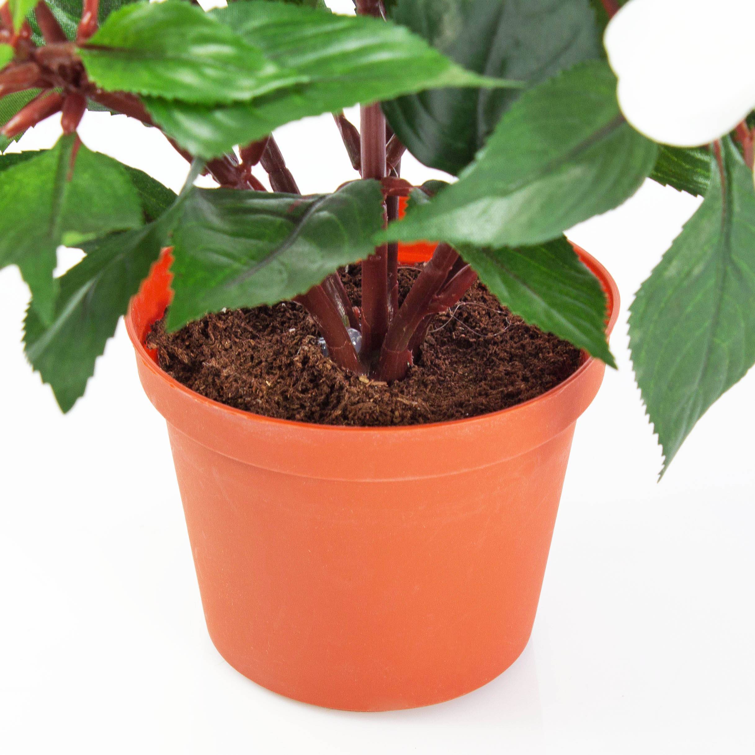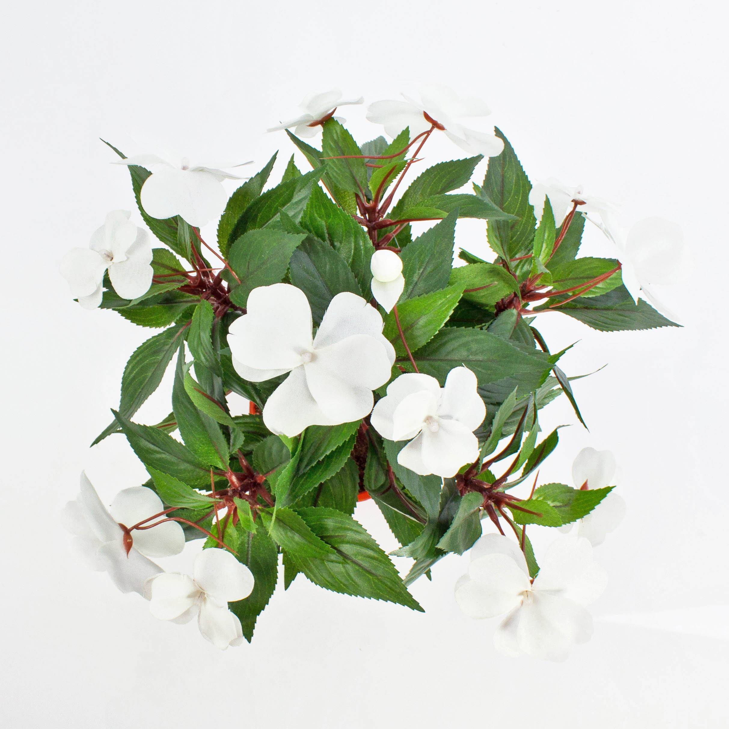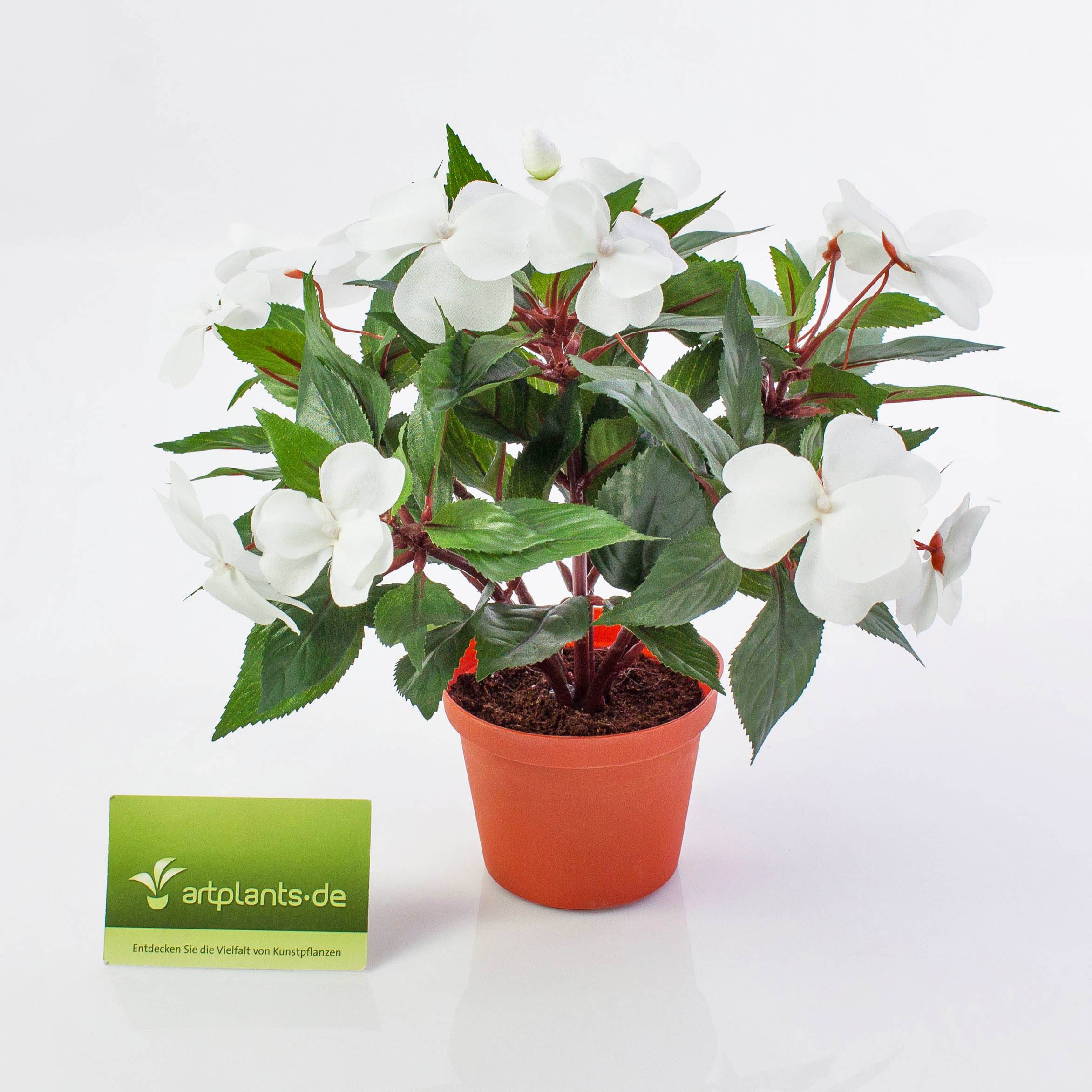 Kunst fleißiges Lieschen AGENI in Blütenfarbe weiß im Kunststoff-Topf. Die Blume hat mit ihren 13 Blüten eine Gesamthöhe von 25 cm.