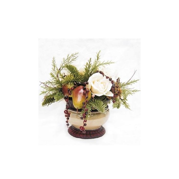 Künstliches Gesteck Rose, Hortensie, Birnen SUKKI, Dekotopf, weiß-rot-grün, 26cm, Ø30cm