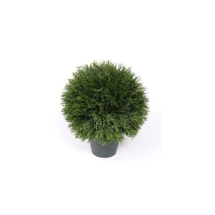 Künstlicher Zypressenball im Topf. Die schön verarbeitete Kugel mit Ihren ca. 290 Zweigen hat einen Durchmesser von 30 cm und ist ingesamt ca. 40 cm hoch.