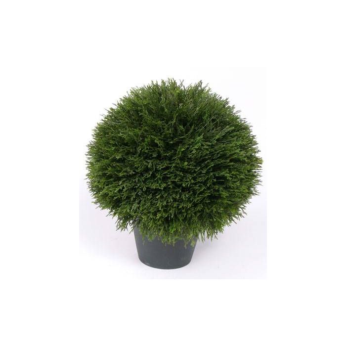Künstlicher Zypressenball im Topf. Die schön verarbeitete Kugel mit Ihren 510 Zweigen hat einen Durchmesser von 40 cm und ist insgesamt ca. 45 cm hoch.
