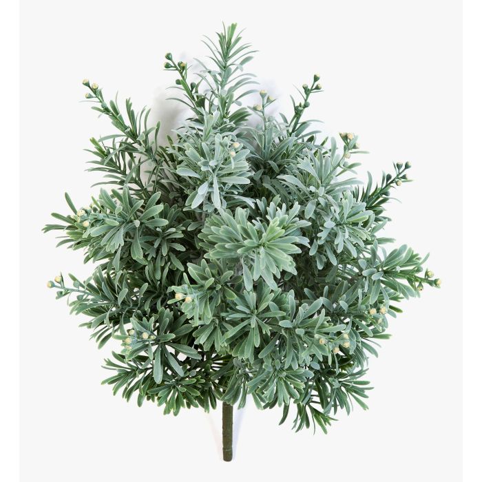 Der künstliche Busch SAKIKO ist auf einem Steckstab befestigt und hat dicke grün-silberne Blätter. In einer Vase ist der ca. 40 cm große Kunstbusch eine schöne Dekoration für Ihren Schreibtisch.