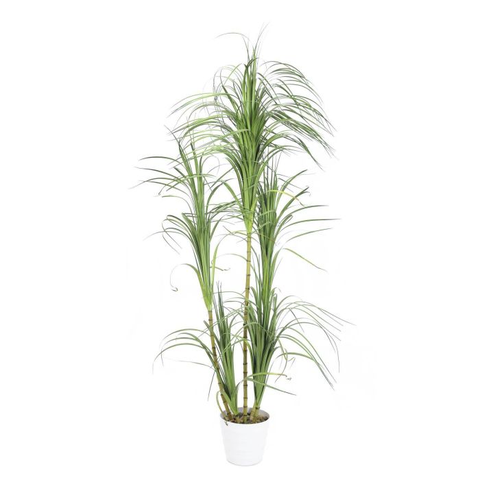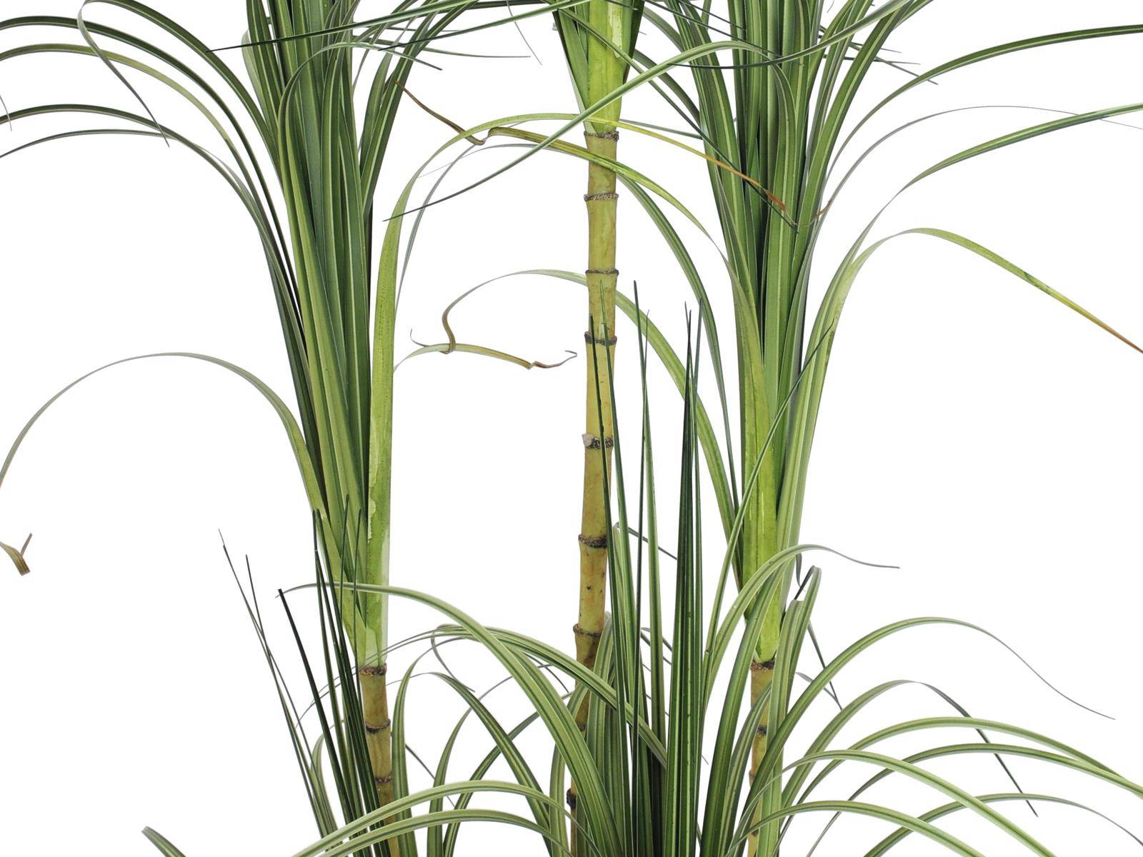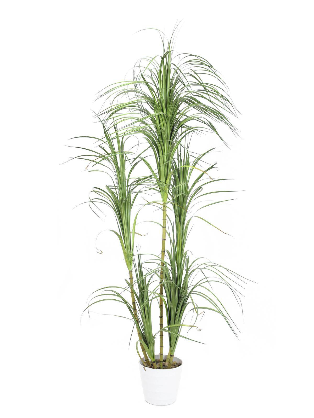 Schöner künstlicher Drachenbaum (Dracaena) mit vielen Grasbüscheln in Farbe grün. Die Kunstpflanze hat im Dekotopf eine Höhe von insgesamt ca. 210 cm.