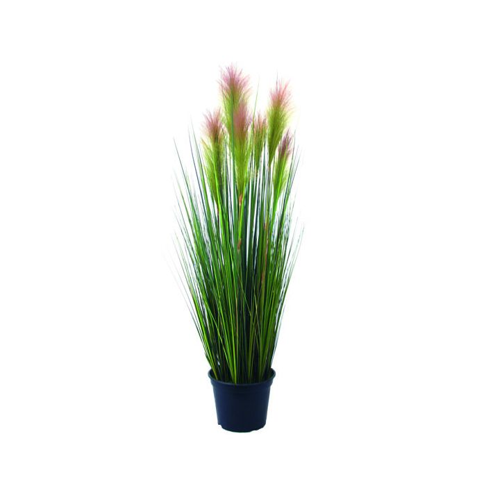 Schönes Plastik-Feder-Gras im Töpfchen. Das künstliche Gras hat dunkelgrüne Halme und rosa farbige Blütenrispen bei einer Gesamthöhe von ca. 90 cm.