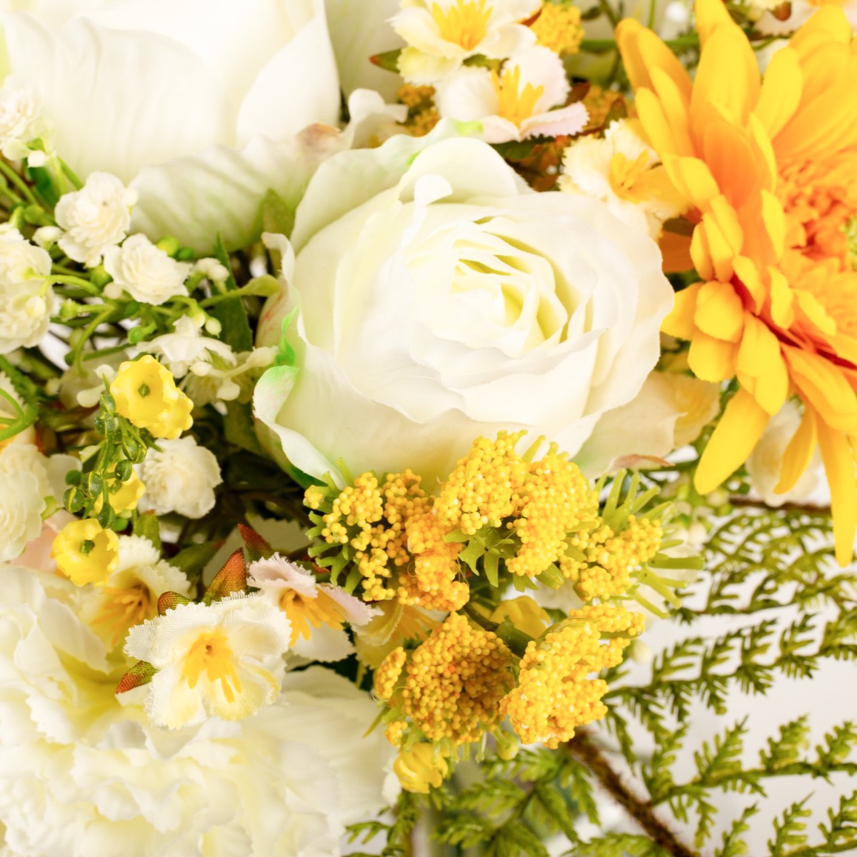 In Deutschland handgebundener künstlicher Strauß MALIA aus einer perfekt aufeinander abgestimmten Blütenkombination. Das Blumenbukett wird von Schafgarbe und Schleierkraut umspielt, ein Abschluss bildet die Blattmanschette aus Asparagus plumosus (Zierspargel / Feder-Spargel). Das Blumenarrangement bietet sich für viele Anlässe wie etwa für den Muttertag, Frauentag, Geburtstag oder einfach als kleine Aufmerksamkeit an.