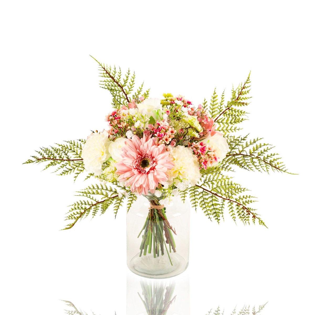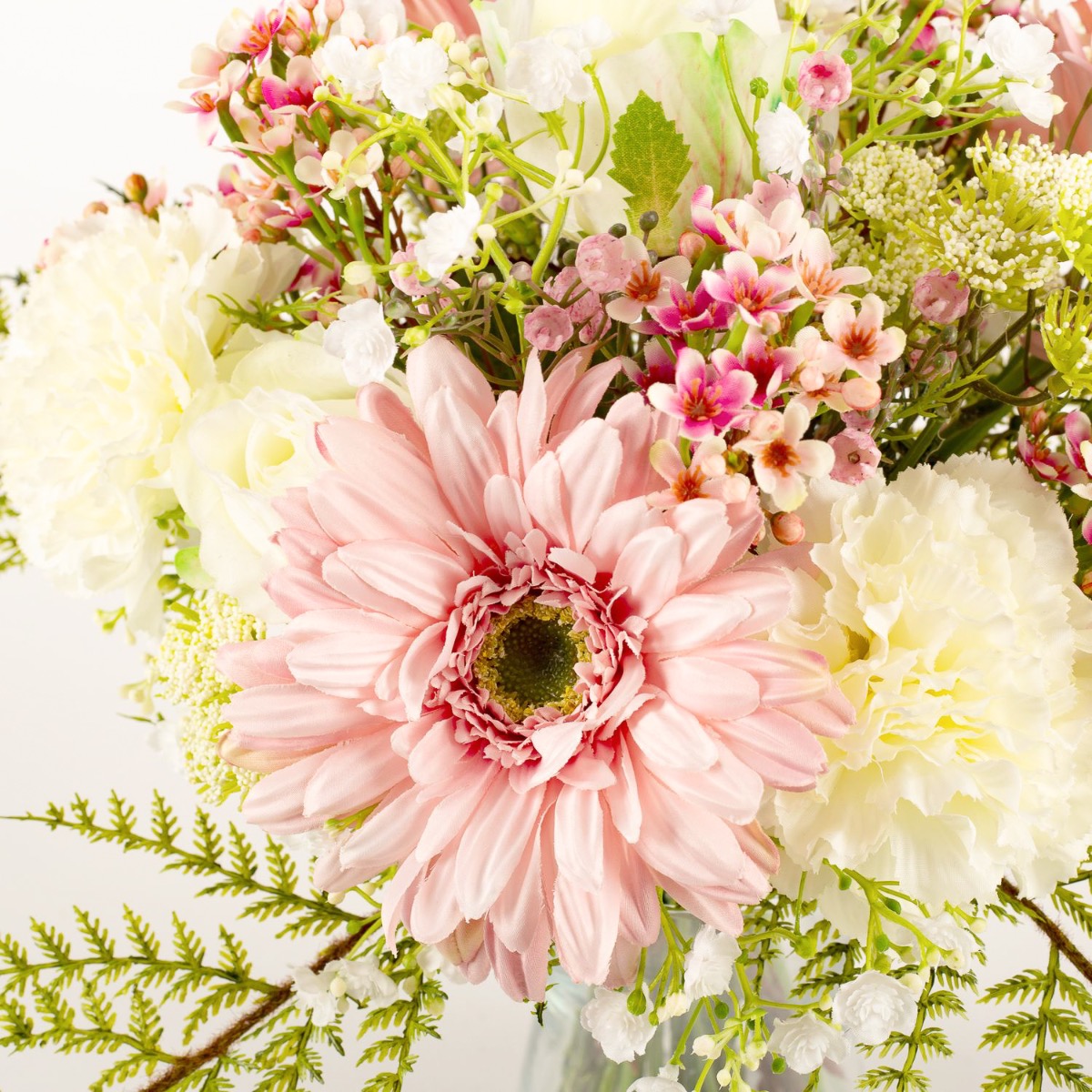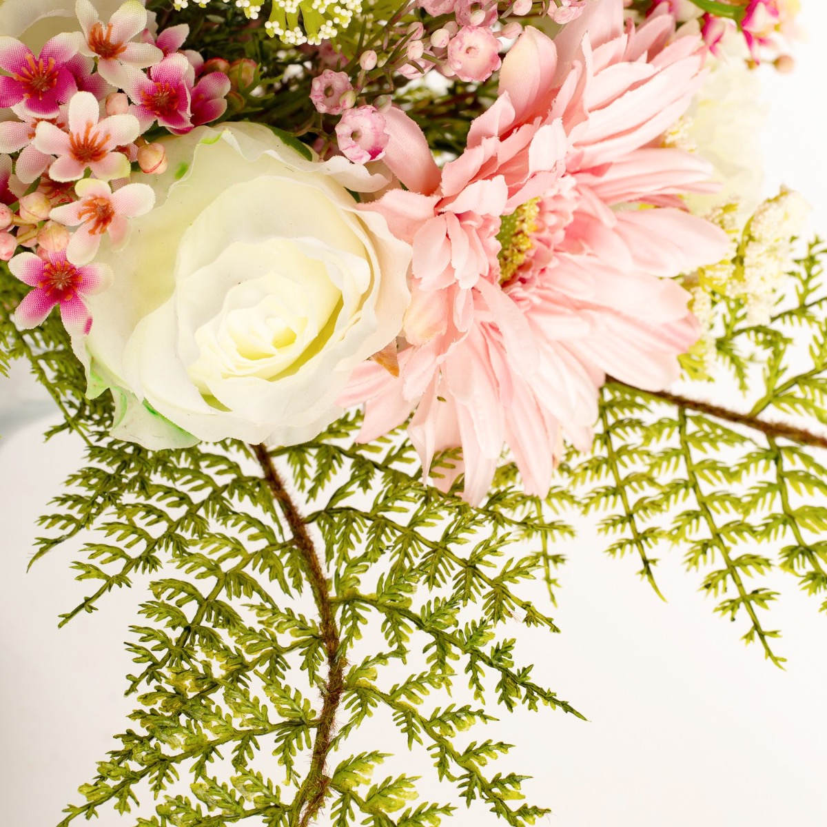 In Deutschland handgebundener künstlicher Strauß MALIA aus einer perfekt aufeinander abgestimmten Blütenkombination. Das Blumenbukett wird von Schafgarbe und Schleierkraut umspielt, ein Abschluss bildet die Blattmanschette aus Asparagus plumosus (Zierspargel / Feder-Spargel). Das Blumenarrangement bietet sich für viele Anlässe wie etwa für den Muttertag, Frauentag, Geburtstag oder einfach als kleine Aufmerksamkeit an.