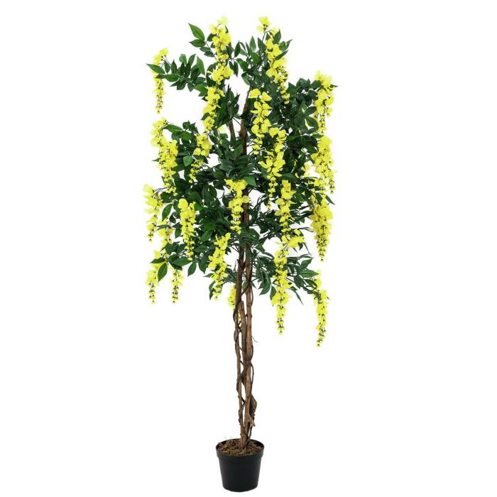 Formschöner künstlicher Goldregenbaum mit 820 gelben Blüten und 1370 Blättern. Die gewundenen Stämme sind 150 cm hoch und von 3 Ranken umwachsen.