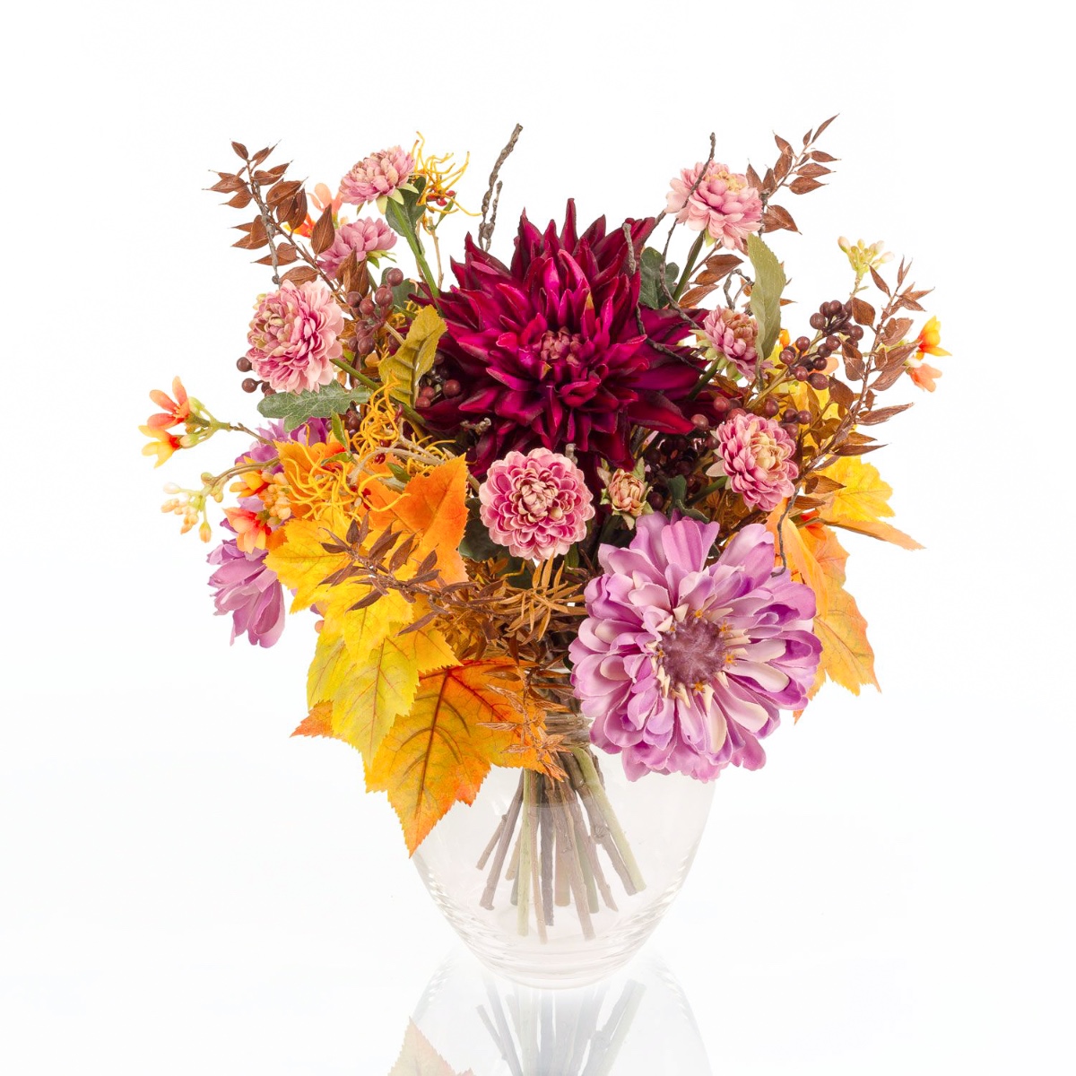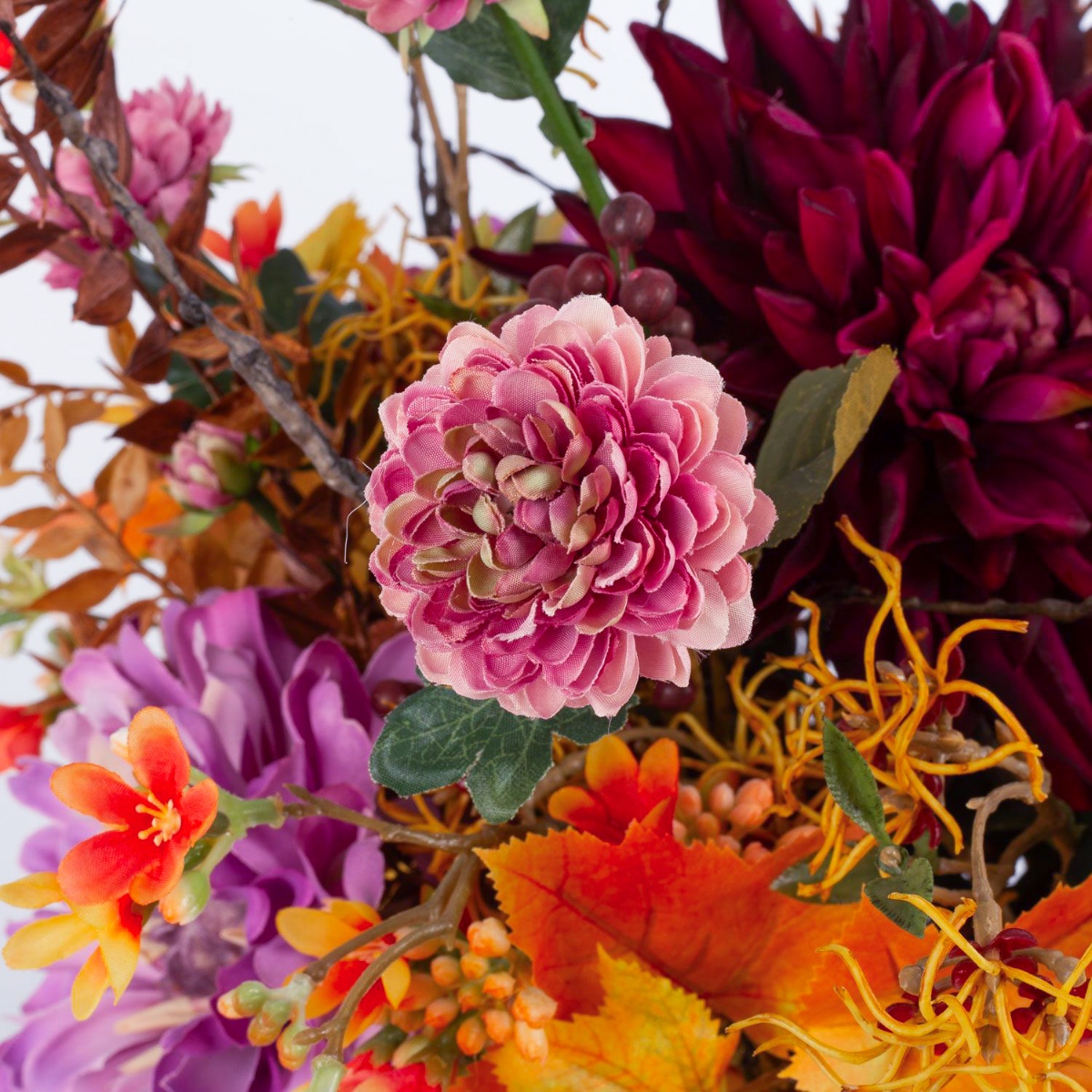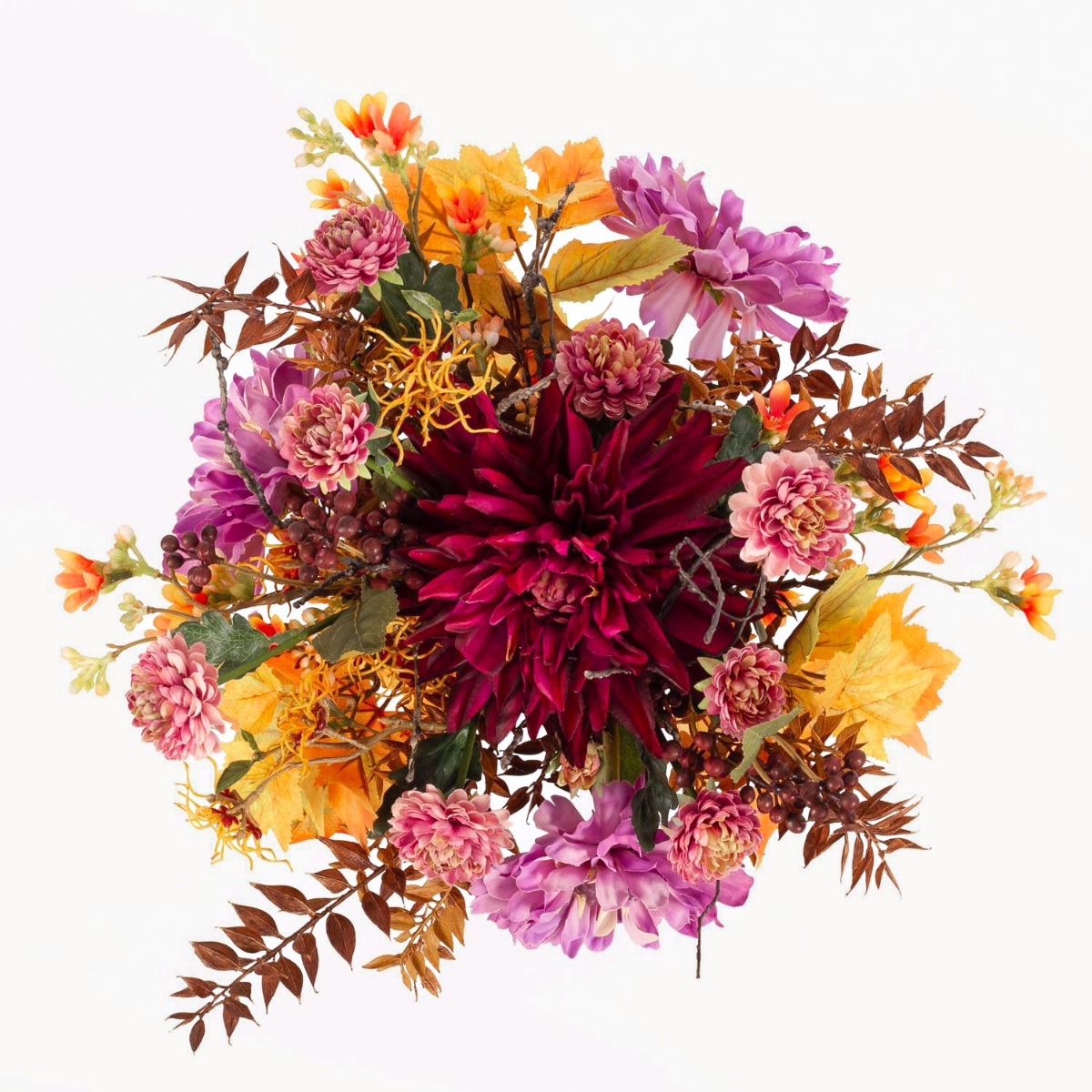 Der künstliche Strauß KALENA setzt sich aus einer üppig leuchtenden Dahlie, Zinnie und Chrysantheme zusammen, ummantelt von Ahorn Blättern. Liebevoll ergänzt wird der Blumenstrauß von Blütenzweigen, Beeren und kleinen Blättern, die dem Arrangement einen besonderen Zauber verleihen.