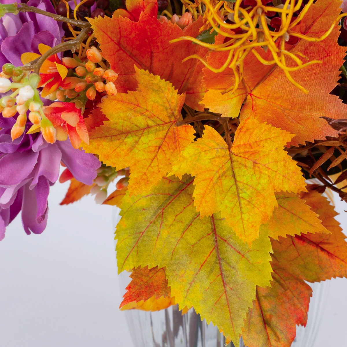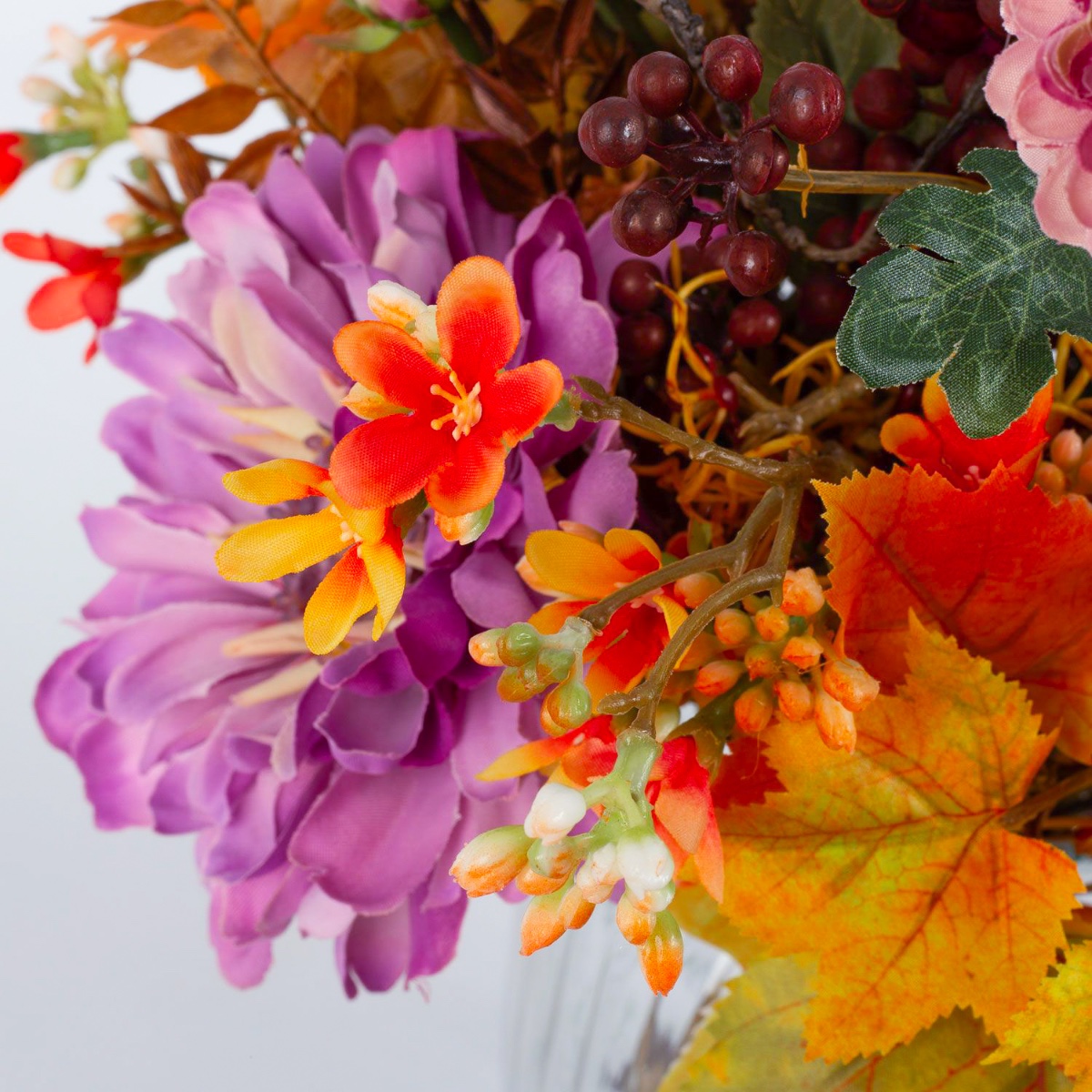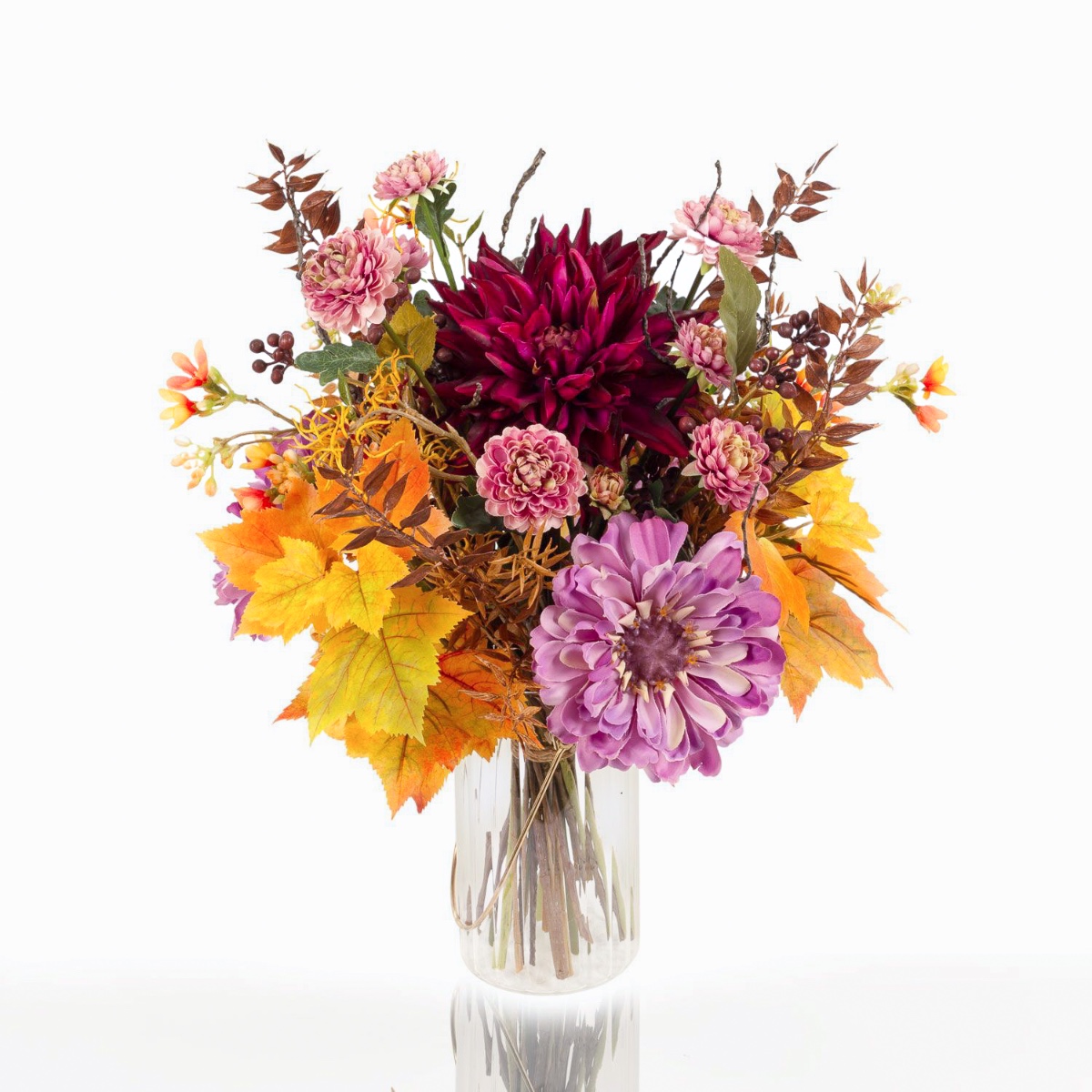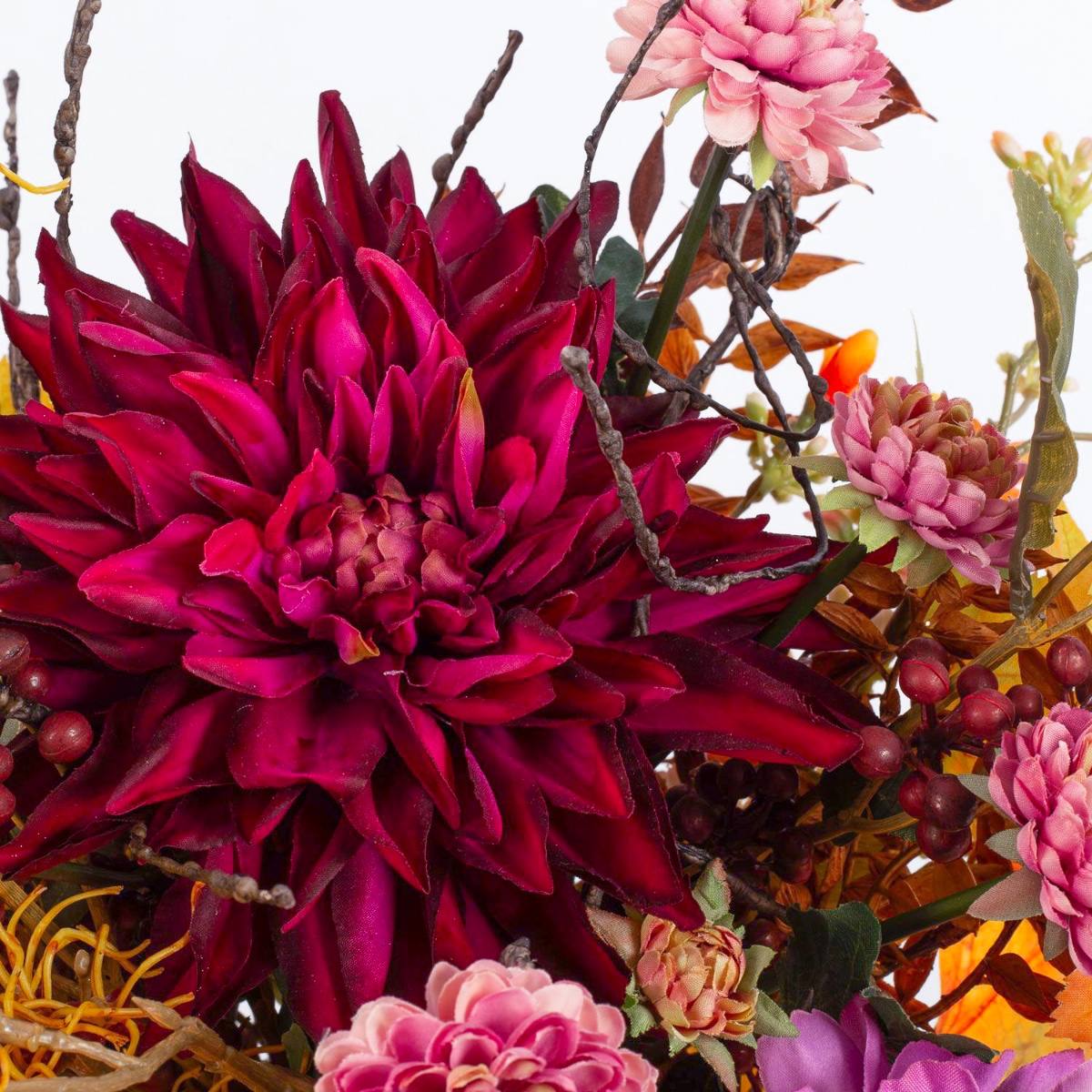 Der künstliche Strauß KALENA setzt sich aus einer üppig leuchtenden Dahlie, Zinnie und Chrysantheme zusammen, ummantelt von Ahorn Blättern. Liebevoll ergänzt wird der Blumenstrauß von Blütenzweigen, Beeren und kleinen Blättern, die dem Arrangement einen besonderen Zauber verleihen.