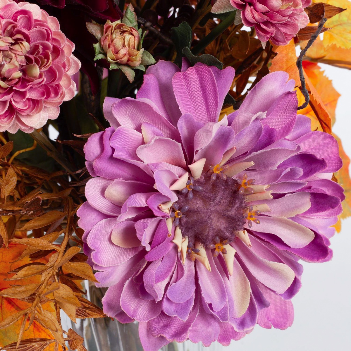 Kunst Herbststrauß KALENA, Dahlie, Zinnie, violett-orange, 40cm, Ø45cm