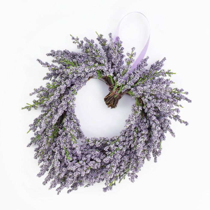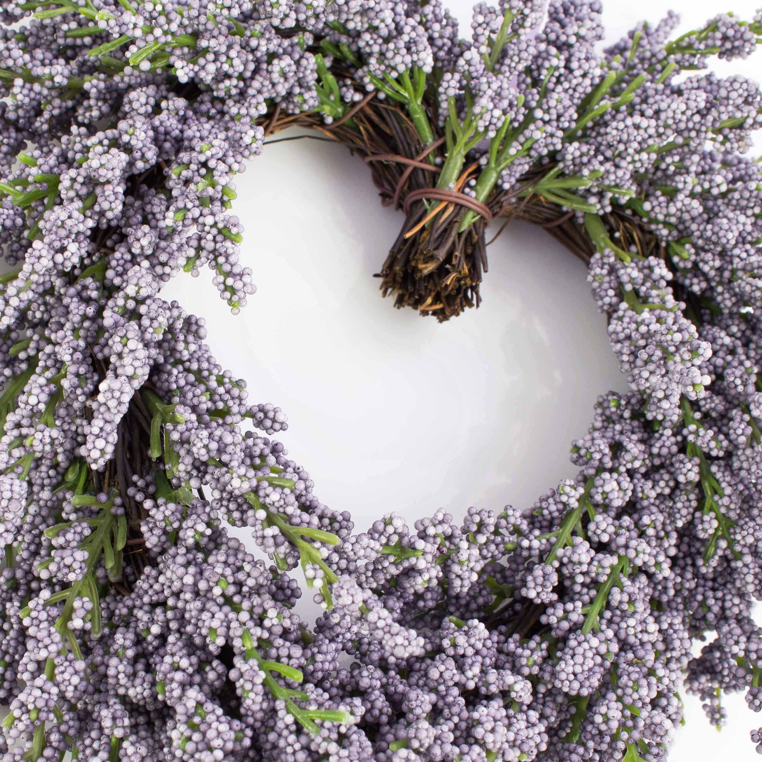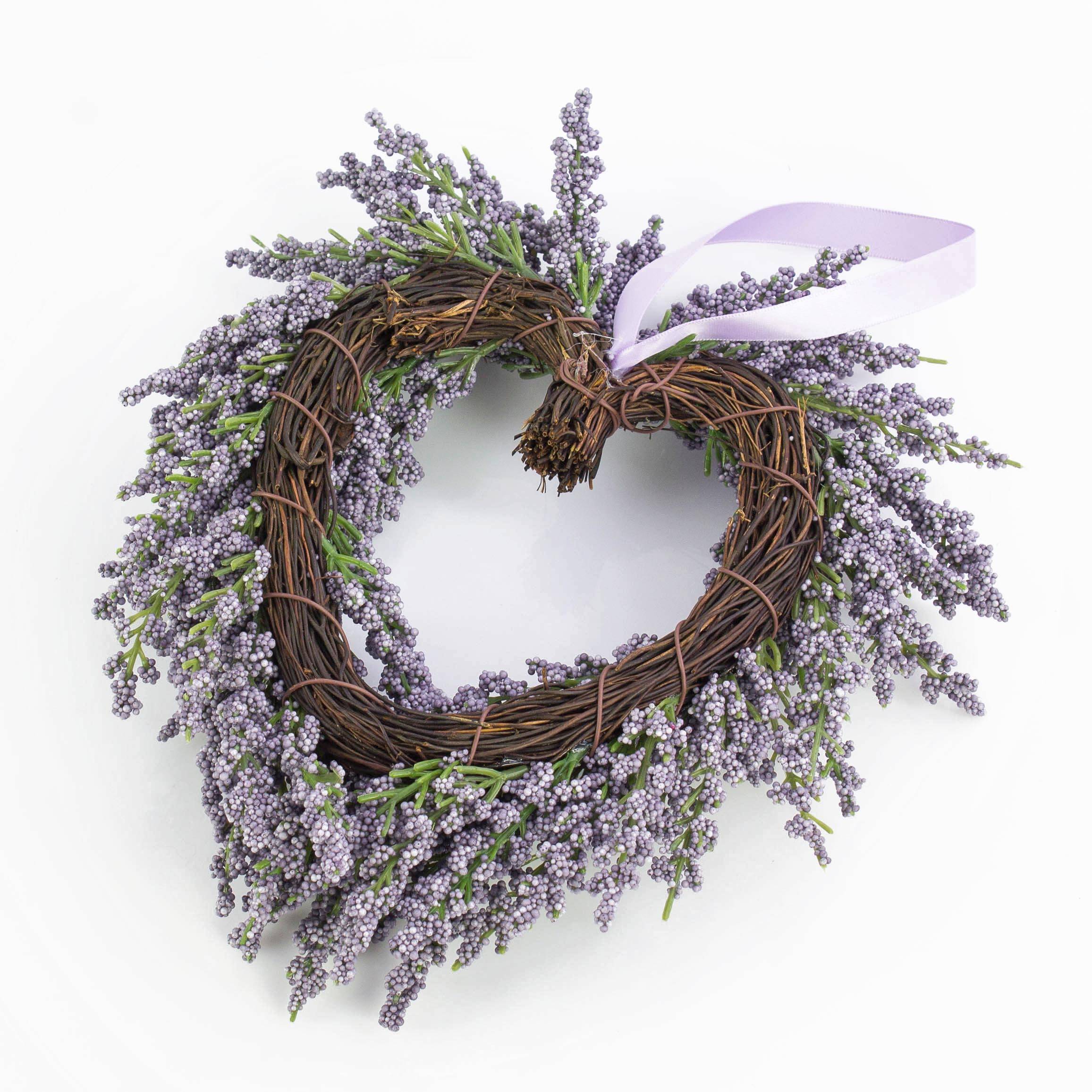Künstlicher Lavendelkranz in Herzform in violett mit einem Außendurchmesser von ca. 20 cm. Der Dekokranz eignet sich gut als Türkranz, Wandkranz oder einfach zur Tischdeko.