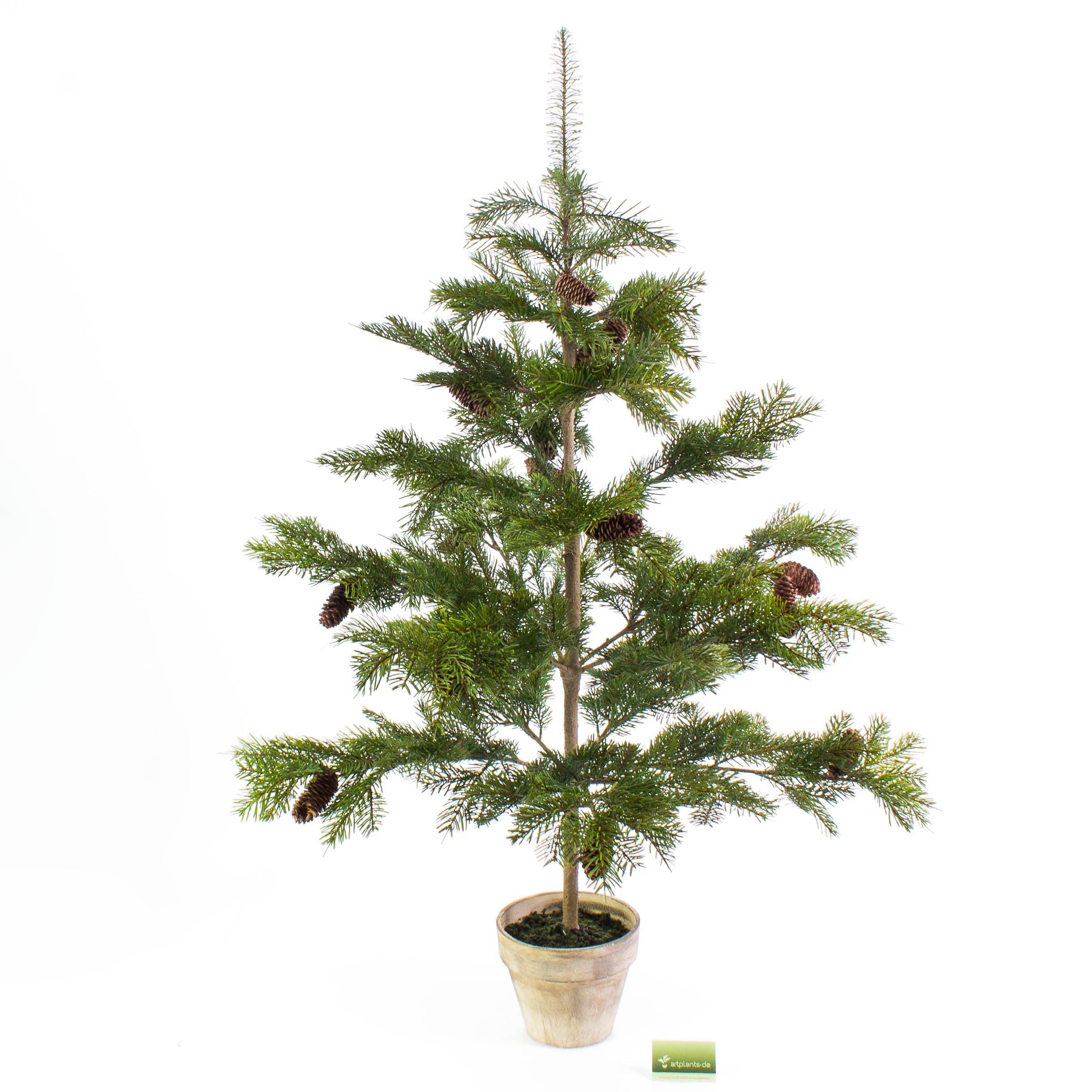Künstlicher Nordmann Tannenbaum im Töpfchen mit Zapfen. Der Weihnachtsbaum passt mit seinen ca. 135 cm in jede Ecke.
