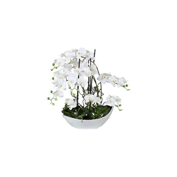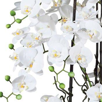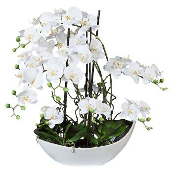 Kunst Orchidee Korkenzieherweide Gesteck TANIN, Keramikschale, Wurzeln, weiß, 70cm