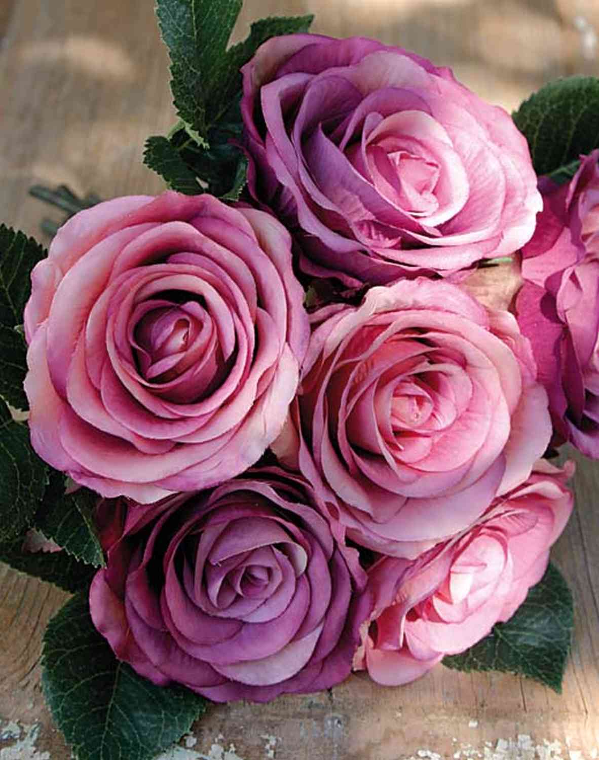 - Aus 6 einzelnen Rosen in Blütenfarbe violett; Blütendurchmesser ca. 8 cm