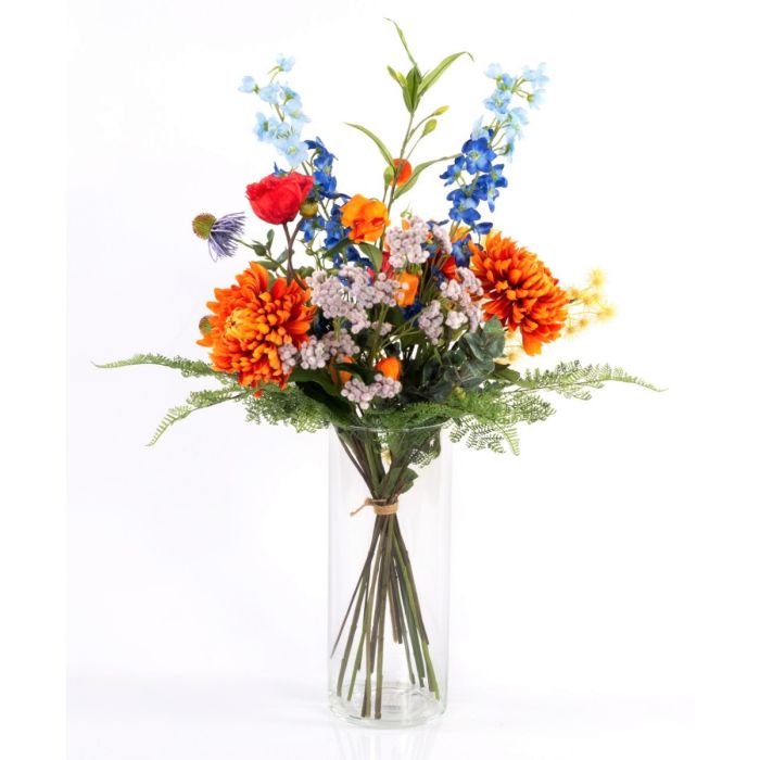 Kunst Sommerstrauß LOLANA, Rittersporn, orange-blau, 70cm, Ø50cm