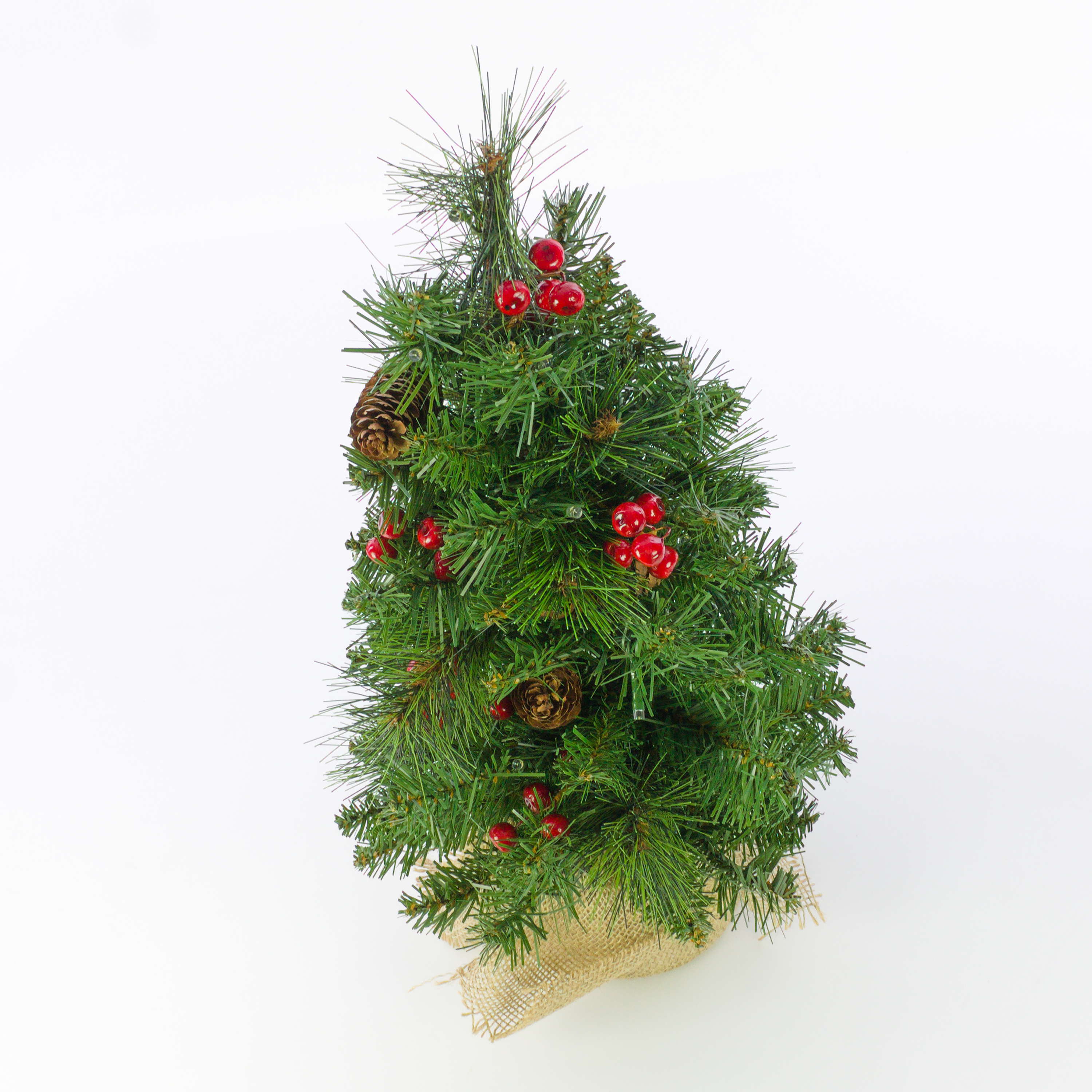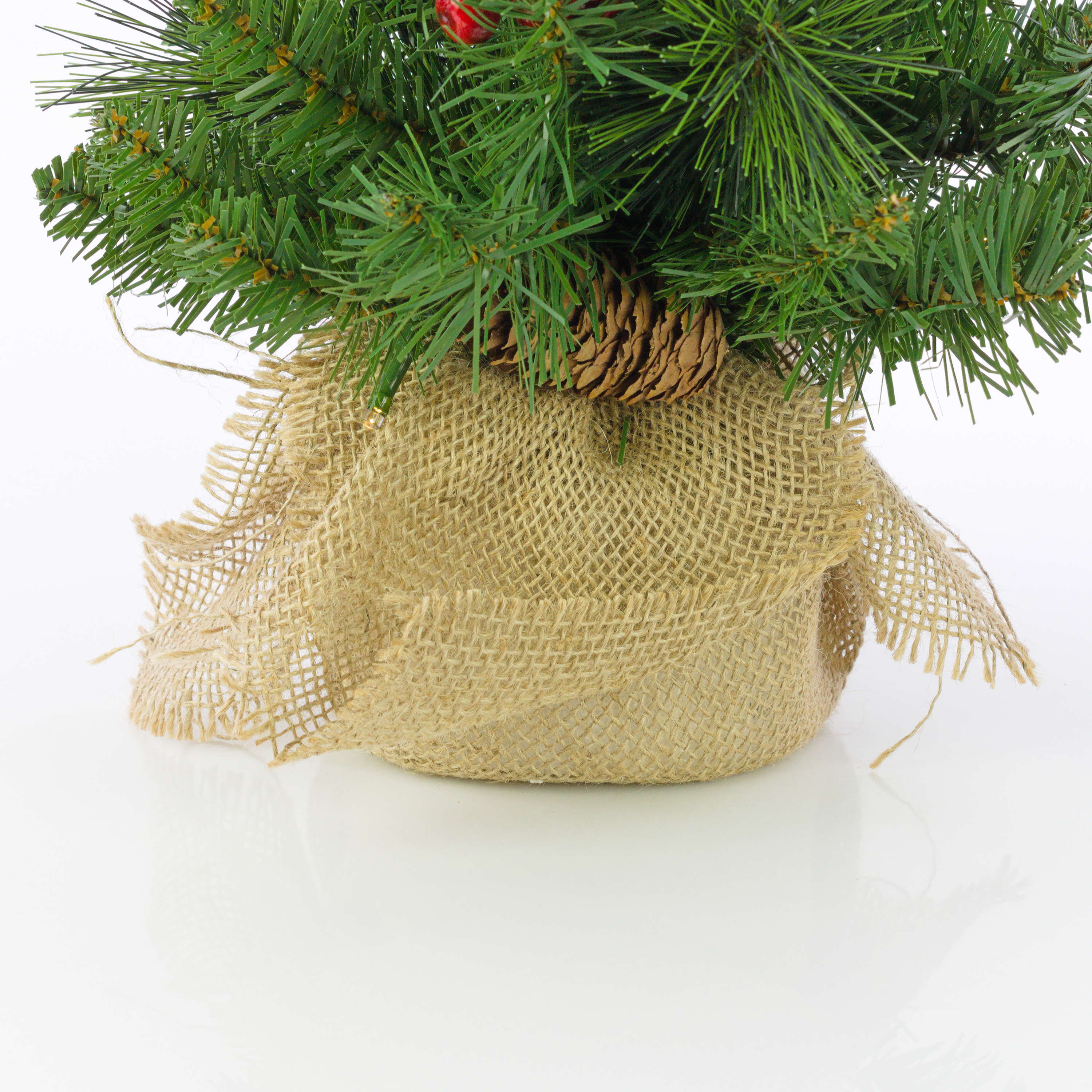 Die künstliche Weihnachtstanne BUKAREST ist mit roten Johannisbeeren, Tannenzapfen und 15 Lichtern geschmückt. Die grünen Kunst Nadelzweige sind biegbar und fest am Baumstamm befestigt. Die Lieferung der ca. 45 cm hohen und ca. 25 breiten Kunst Tanne erfolgt in einem braunen Jute Sack.