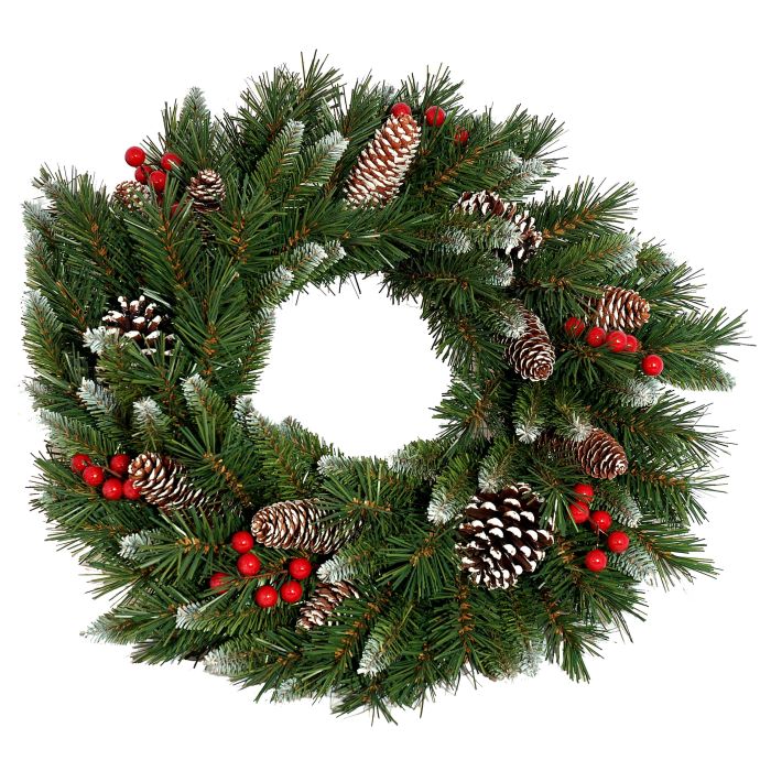 - Beschneiter künstlicher Kranz mit Zapfen und roten Beeren