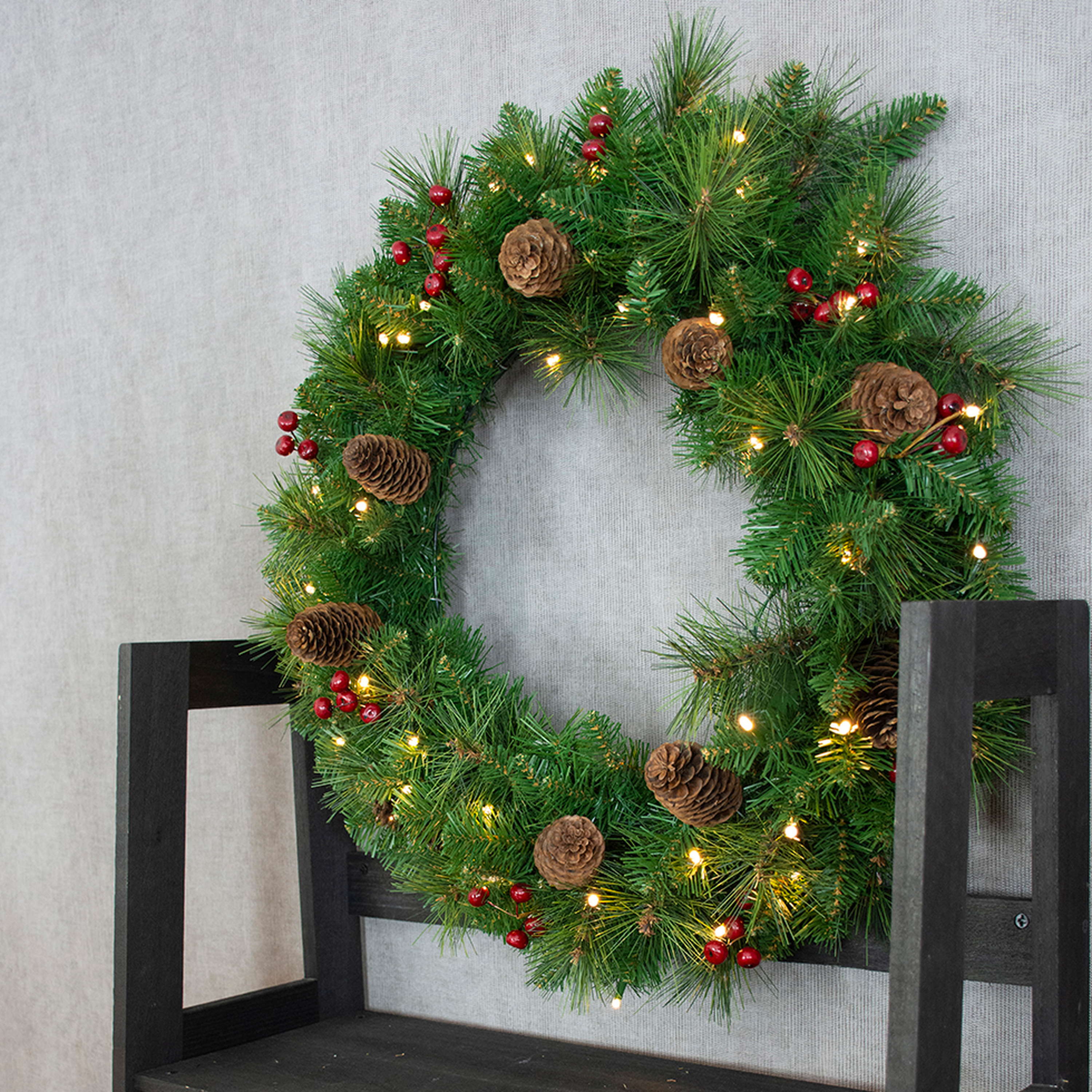 - Mit Johannisbeeren, Zapfen, Lichterkette (50 LEDs) und 160 Nadelzweigen aus hochwertigen PVC Material