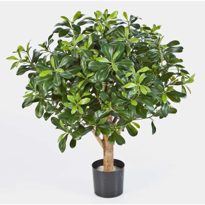 Der Plastik Baum ETHAN hat grüne abgerundete Blätter und eine runde Baumkrone. Der Pittosporum hat einen braunen Stamm und ist insgesamt ca. 65 cm hoch.