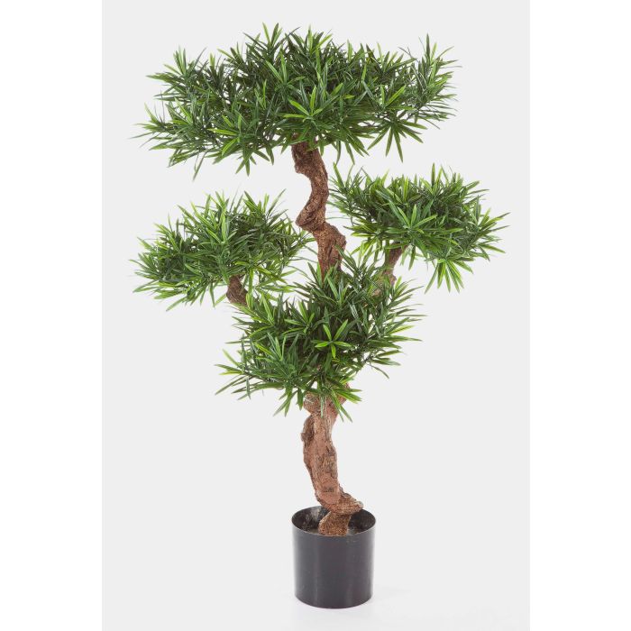 Der künstliche Baum TITUS hat einen braunen, gedrehten Naturstamm und ovale Blätter in verschiedenen Grüntönen. Mit seiner Höhe von ca. 110 cm dekoriert der Kunst Podocarpus beispielsweise Ihre Saunawelt.