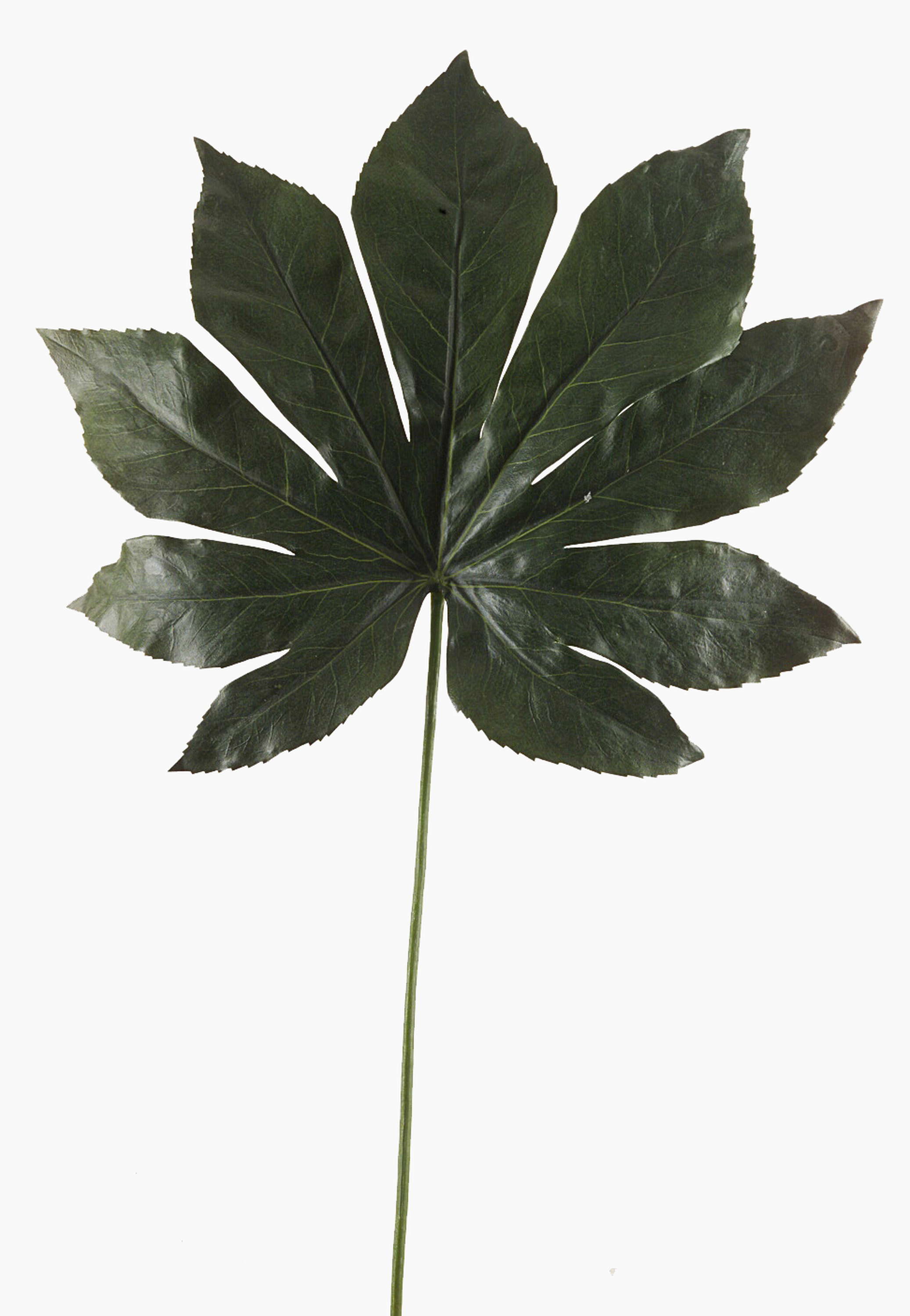 Dekoblatt Aralia FARIS mit detaillierten Blattoberfläche und hübschen Blattadern auf Vorder- und Rückseite des Blattes. Das künstliche Aralien-Blatt gestaltet Regale, Wände, uvm.