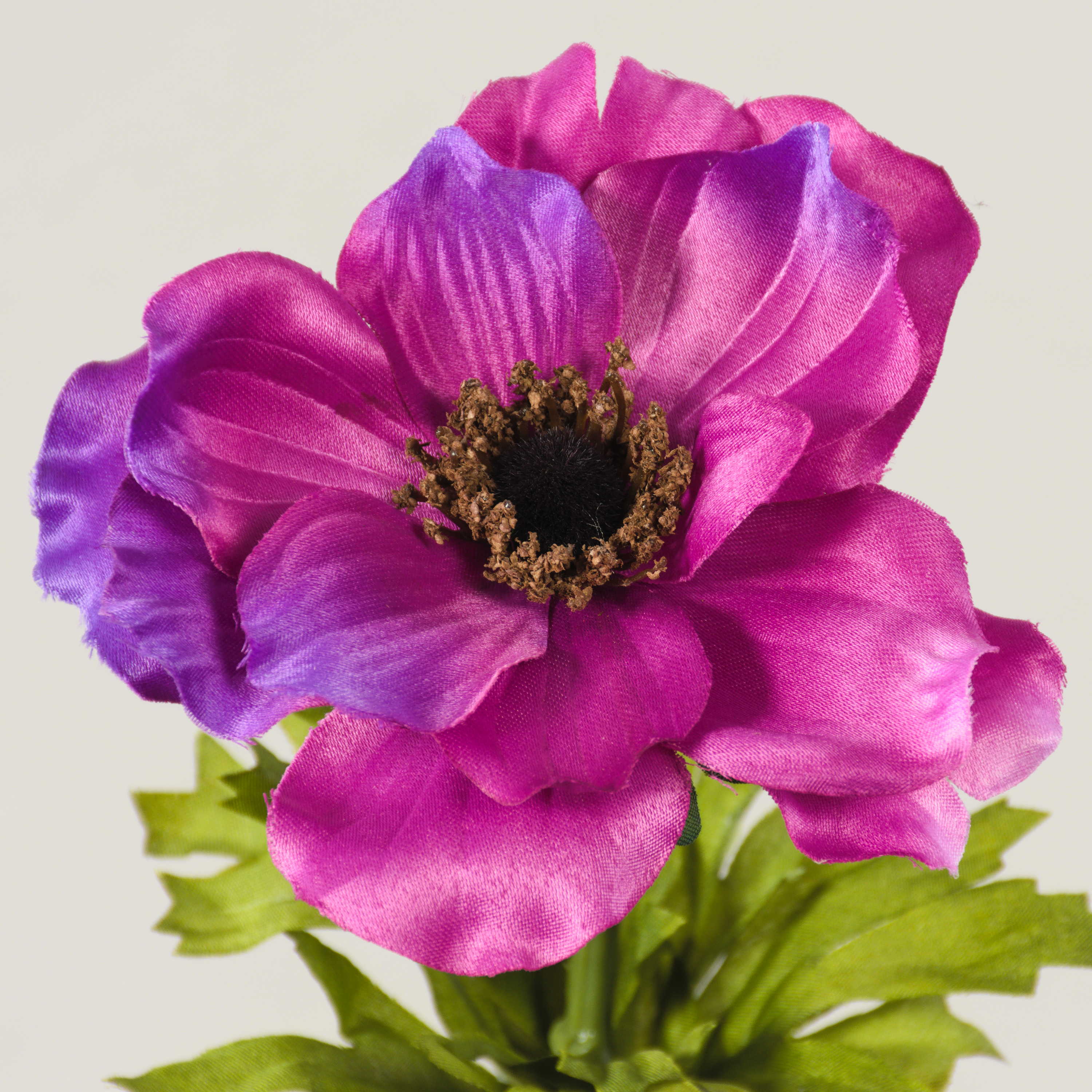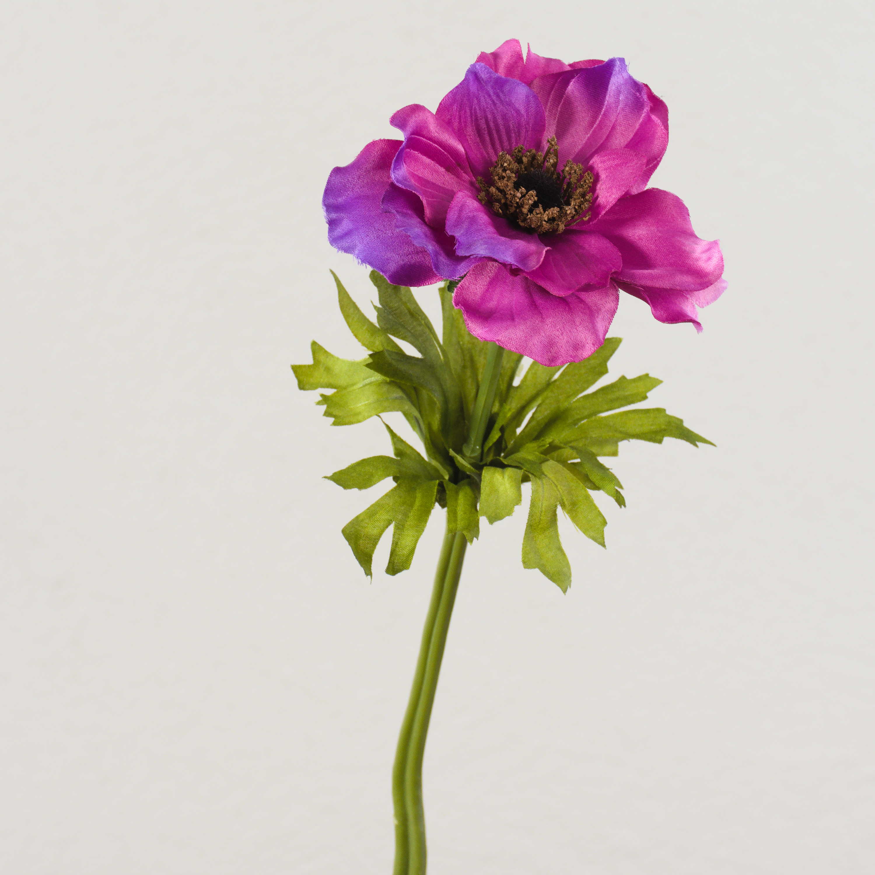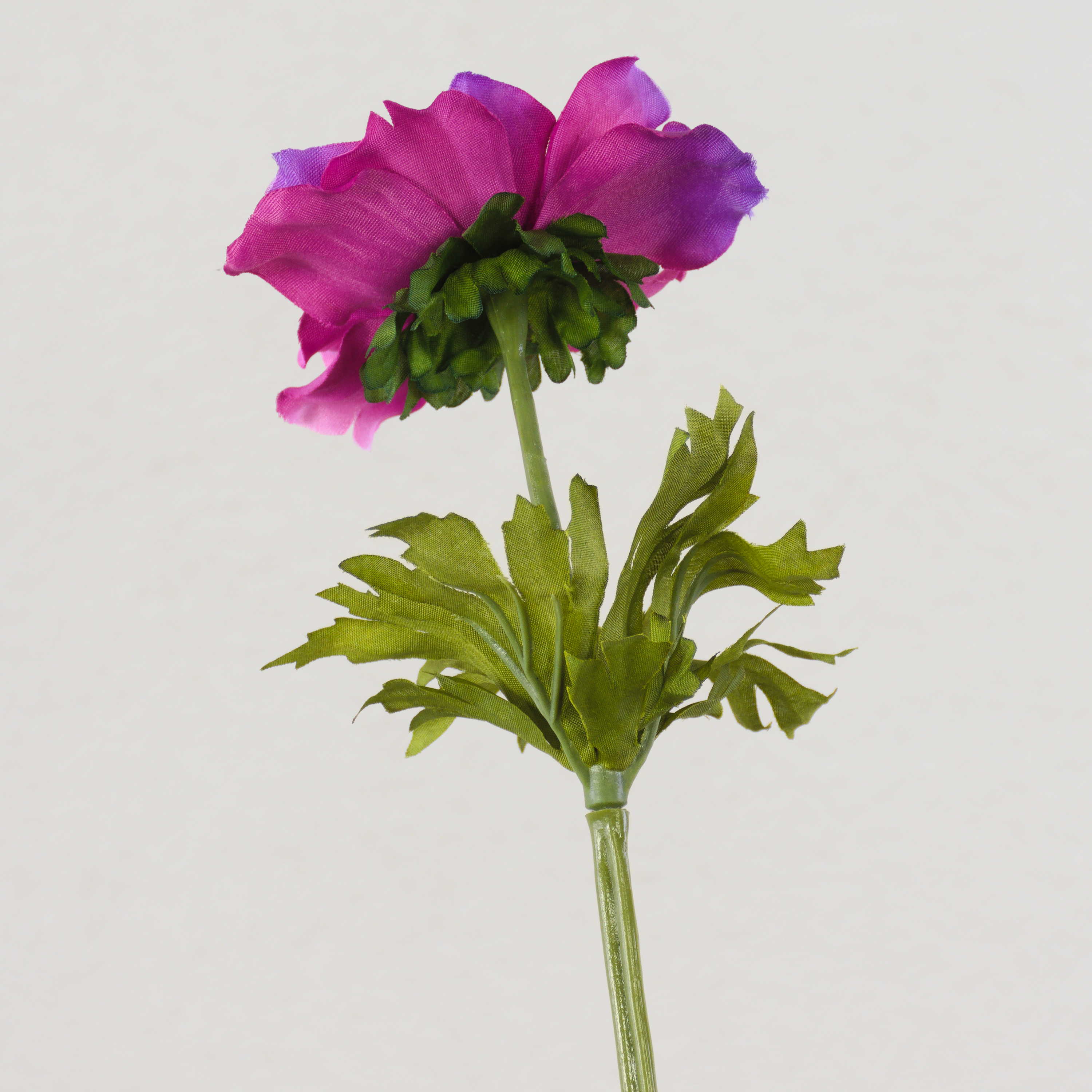 Deko Anemone in Farbe cerise. Die Blume hat hellgrüne Blätter und ist 35 cm lang.