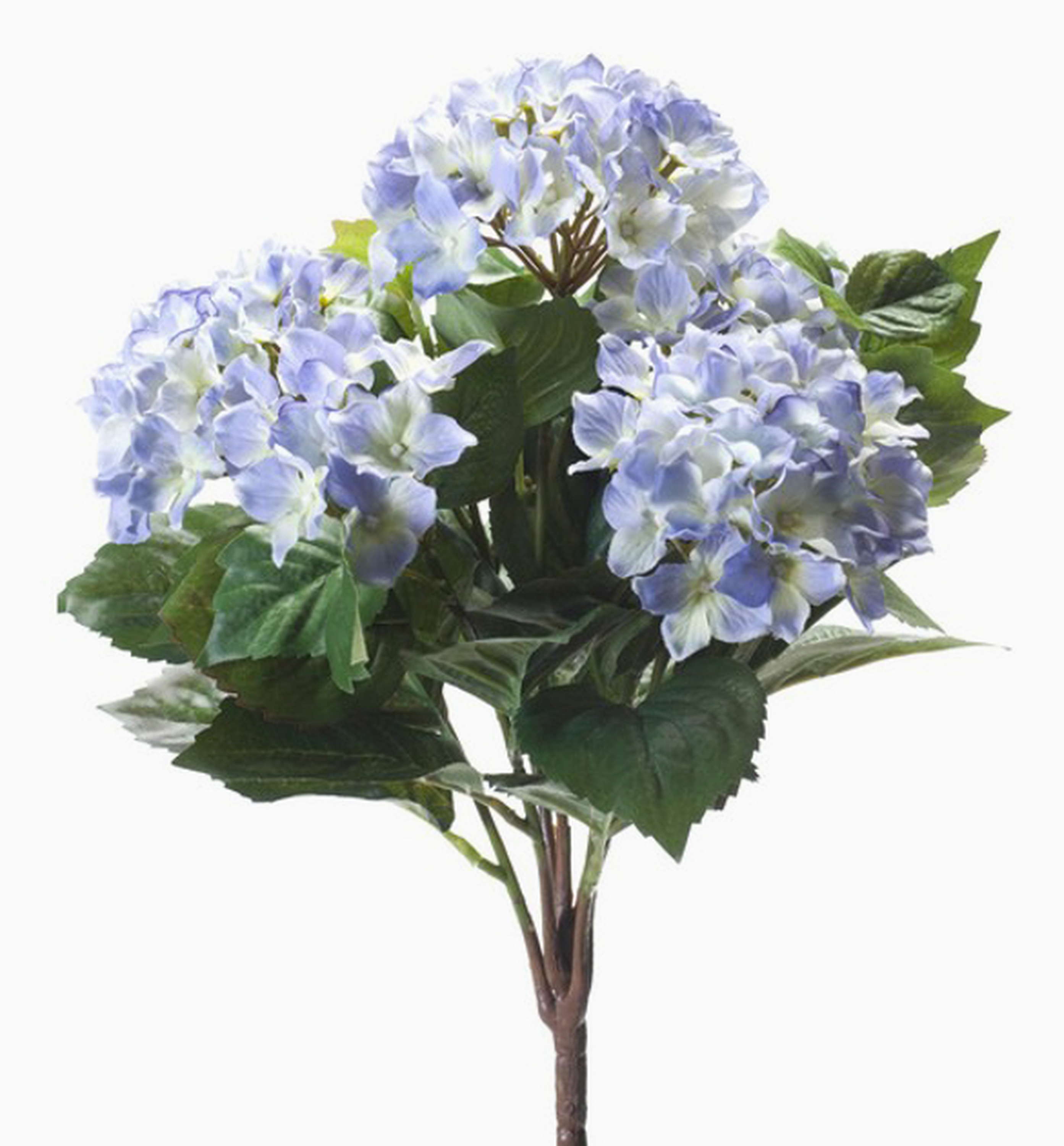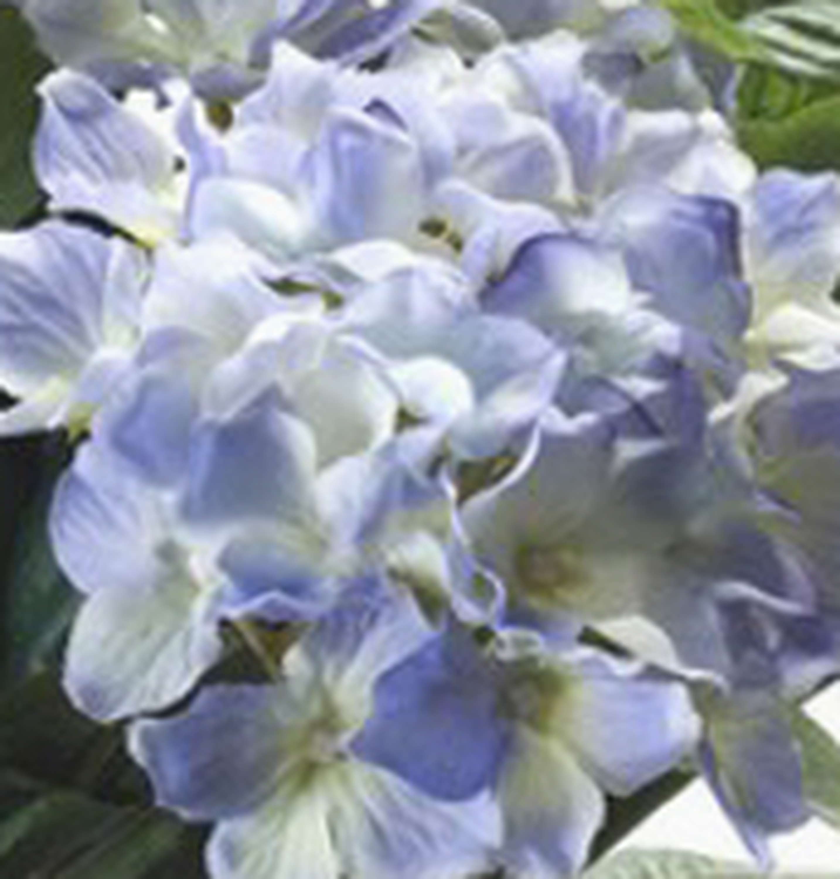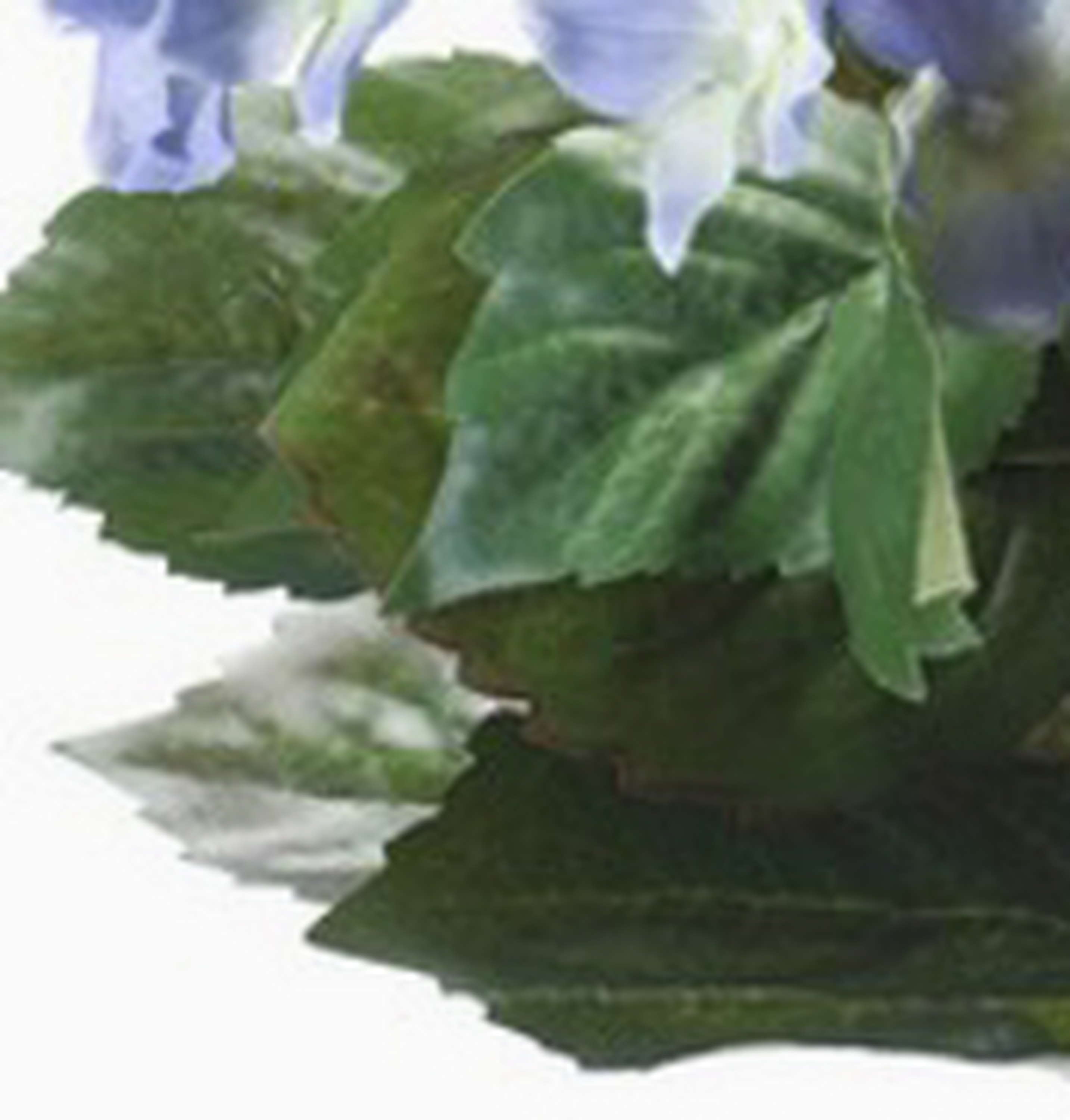 Die künstliche Hortensie LAIDA in Farbe hellblau ist auf Steckstab befestigt und hat eine Höhe von ca. 35 cm.