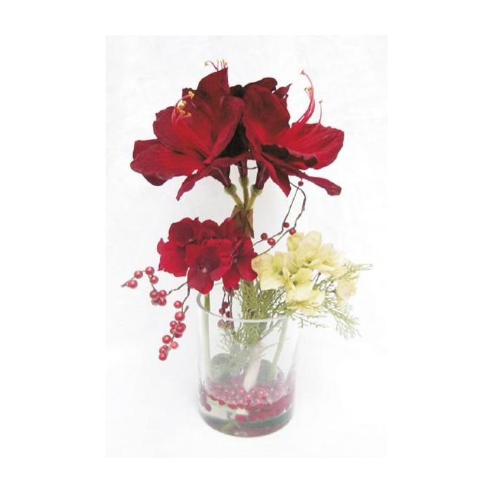 Kunstblumen Gesteck Amaryllis, Hortensie TASHI, Dekoglas, rot-creme, 40cm, Ø23cm
