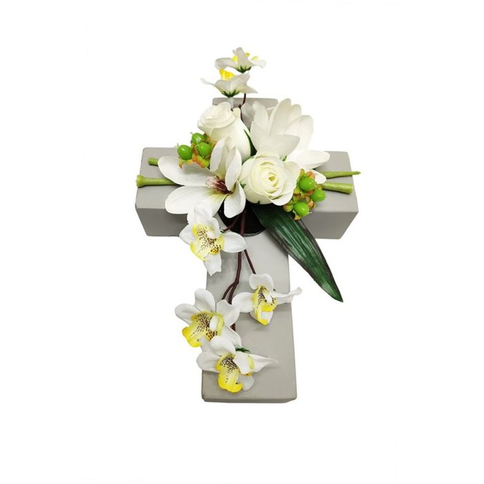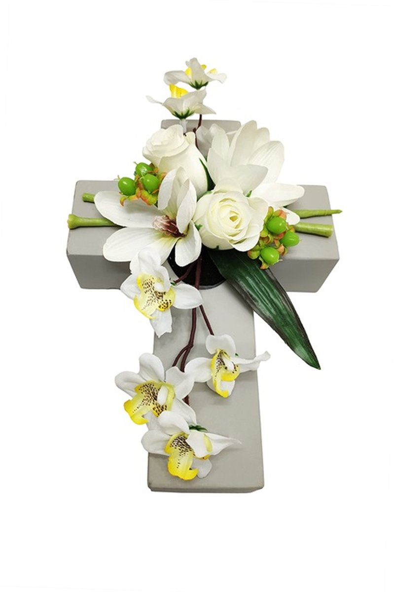 Kunstblumen Gesteck Magnolie, Orchidee, Rose OVANA, Pflanzkreuz, weiß, 28x18x10cm