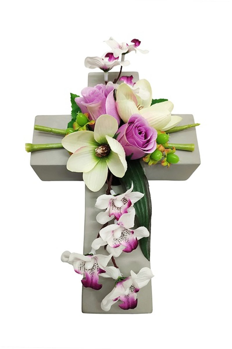 - Das geschmackvolle Blumengesteck auf einem Kreuz ist eine schöne Bereicherung z.B. für den Grabschmuck, bitte beachten Sie das wir für die Verwendung im Außenbereich keine Garantie auf die Langlebigkeit und Beständigkeit geben können, die Kunstblumen können sich durch die UV-Strahlung verfärben, brüchig werden oder durch Wind abreißen!