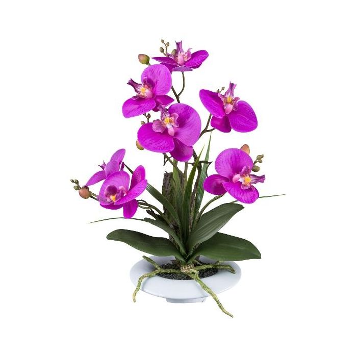 Kunstblumen Gesteck Orchidee Phalaenopsis HIKABU mit Korkenzieherweide, Keramiktopf, Wurzeln, lila, 40cm