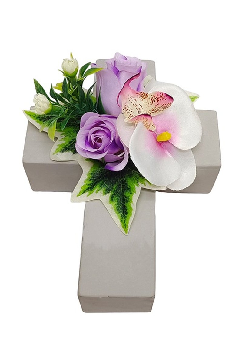 Kunstblumengesteck Phalaenopsis Orchidee, Rose ARLOMA, Pflanzkreuz, weiß-lila, 20x15x11cm