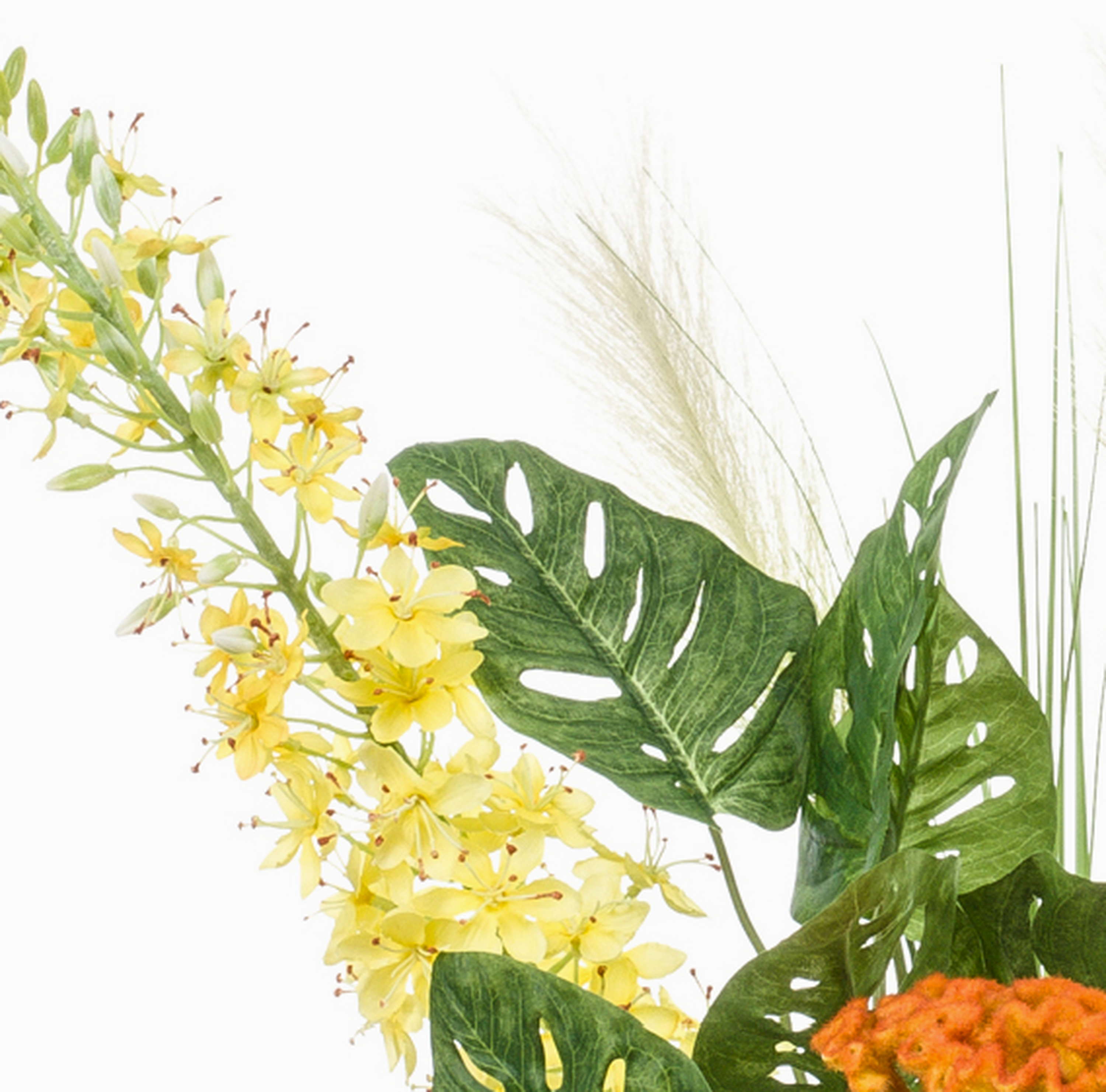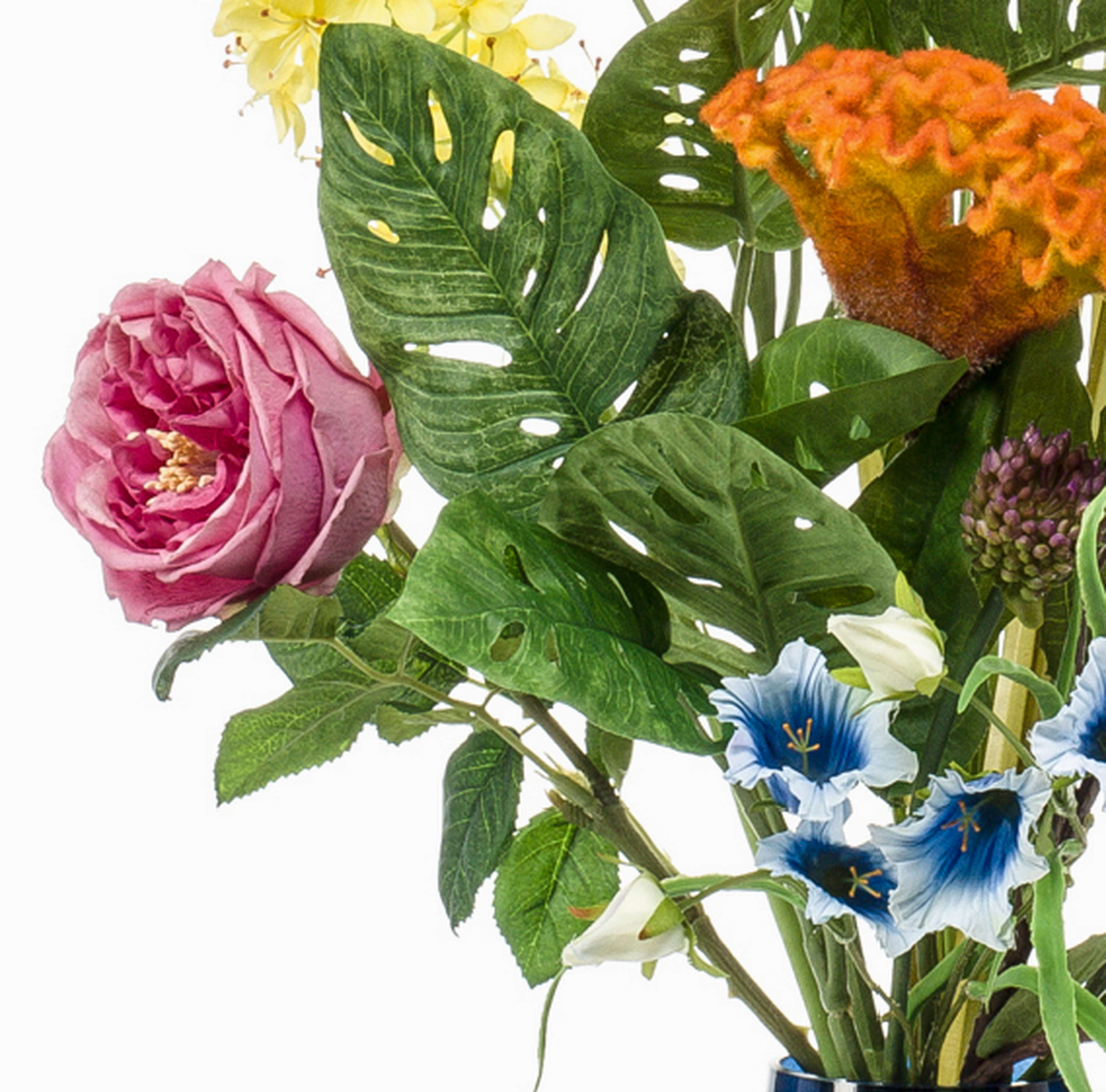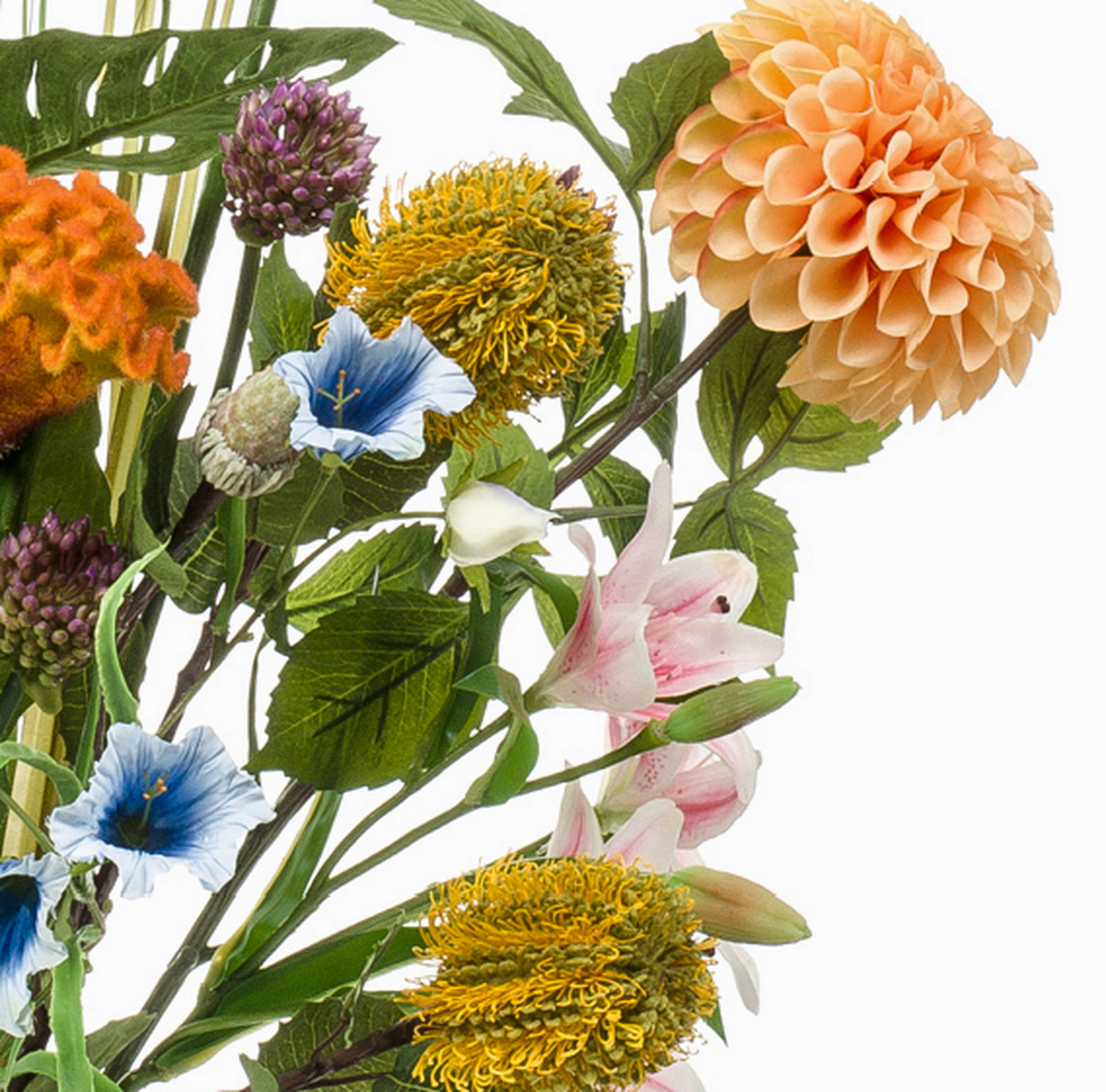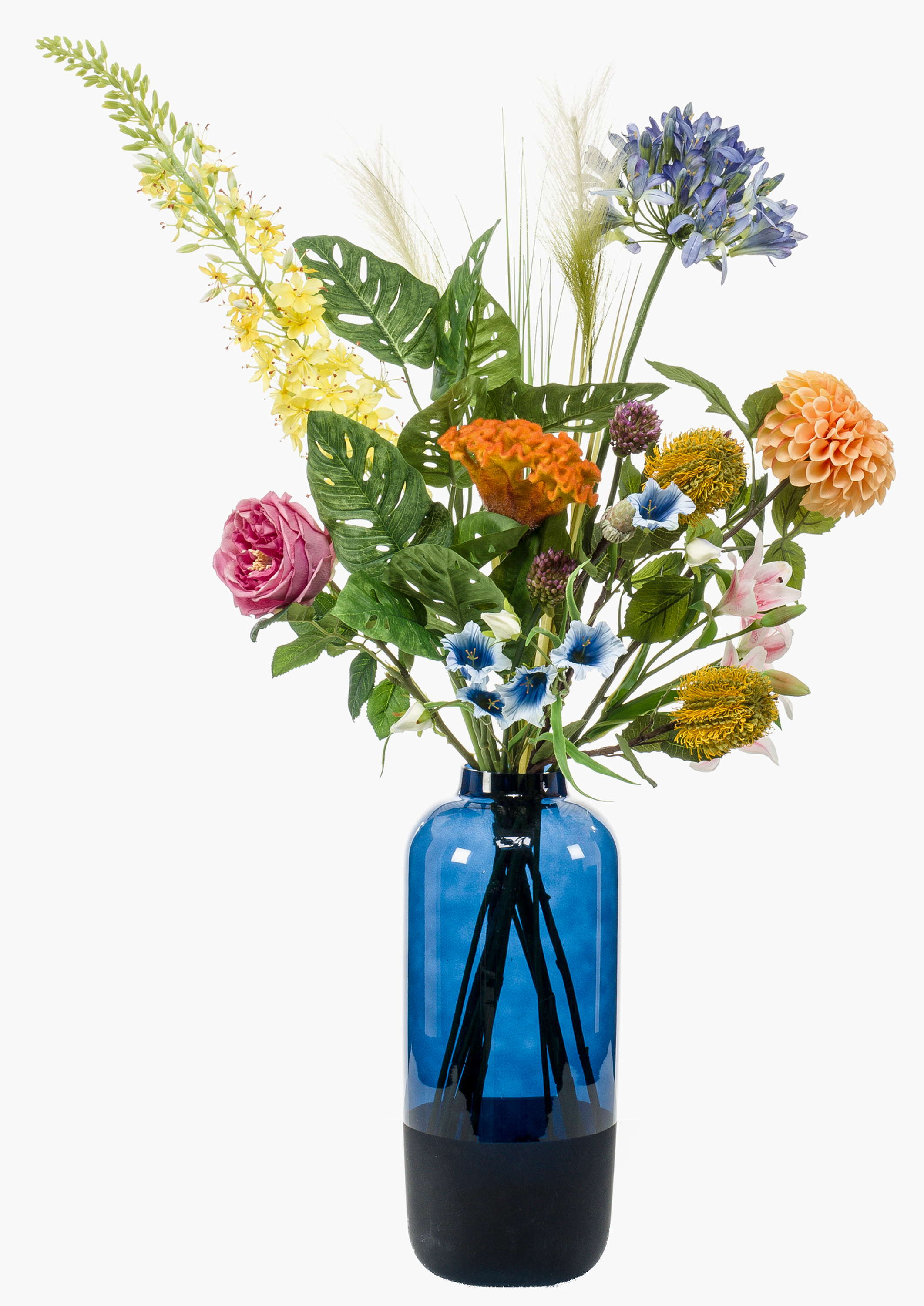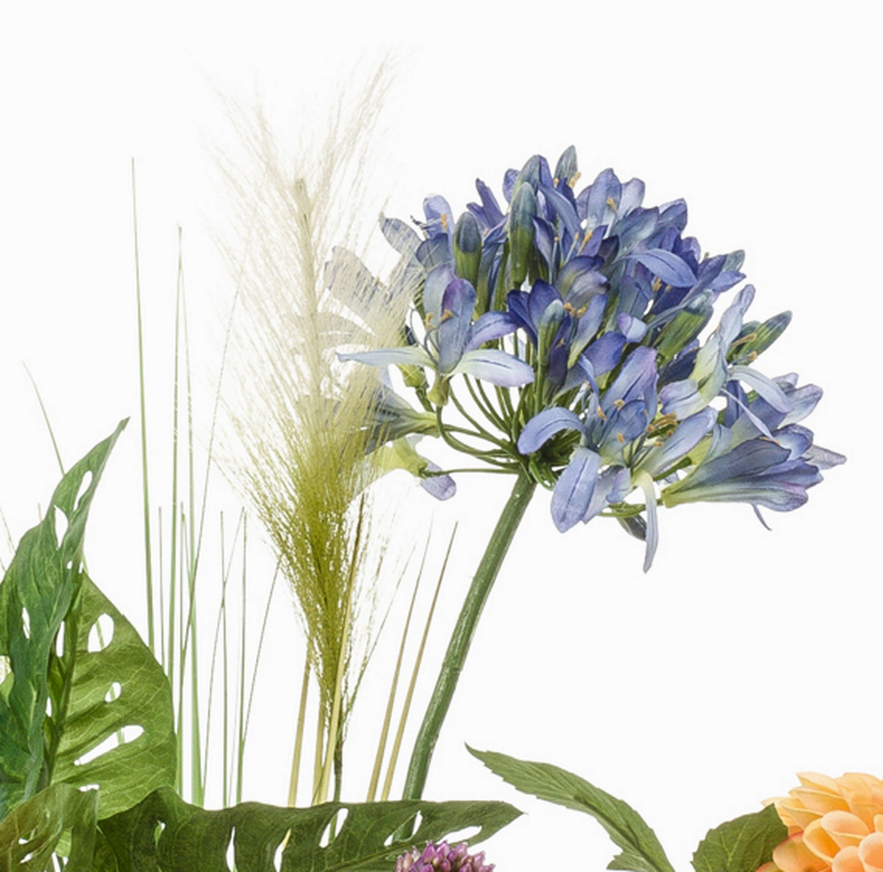 - Kunstblumen Gesteck bestehend aus Agapanthus, Dahlie, Steppenkerze, Hahnenkamm, Rose, Banksia, Glockenblume, Lilie, Pampasgras und Philodendron in Farbe bunt
