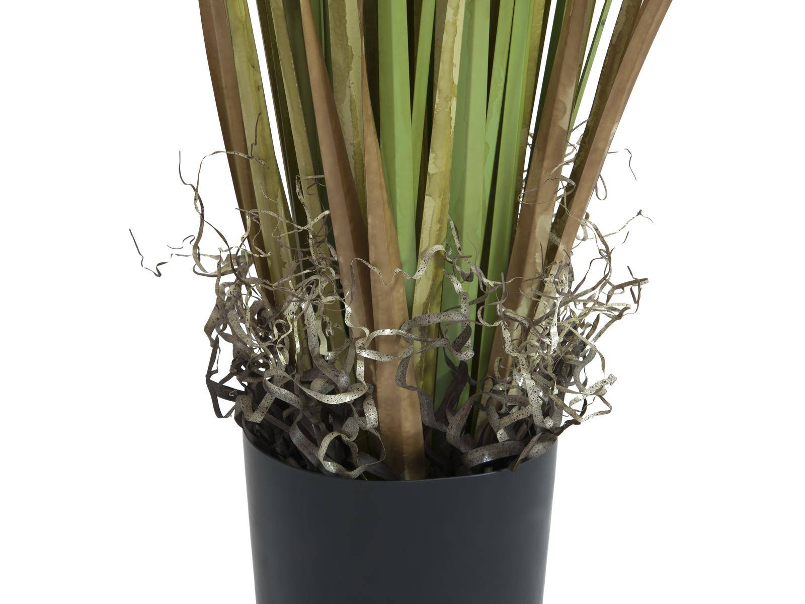 Kunstpflanze ISABEL in grün-braunen Farbnuancen mit einigen Rispen der Pusteblume in Farbe weiß. Für eine natürliche Optik sorgen die braun-gelben verdorrten Grashalme oberhalb des Zementtopfes des Arrangements. Insgesamt hat das Kunstgras eine Höhe von ca. 105 cm.