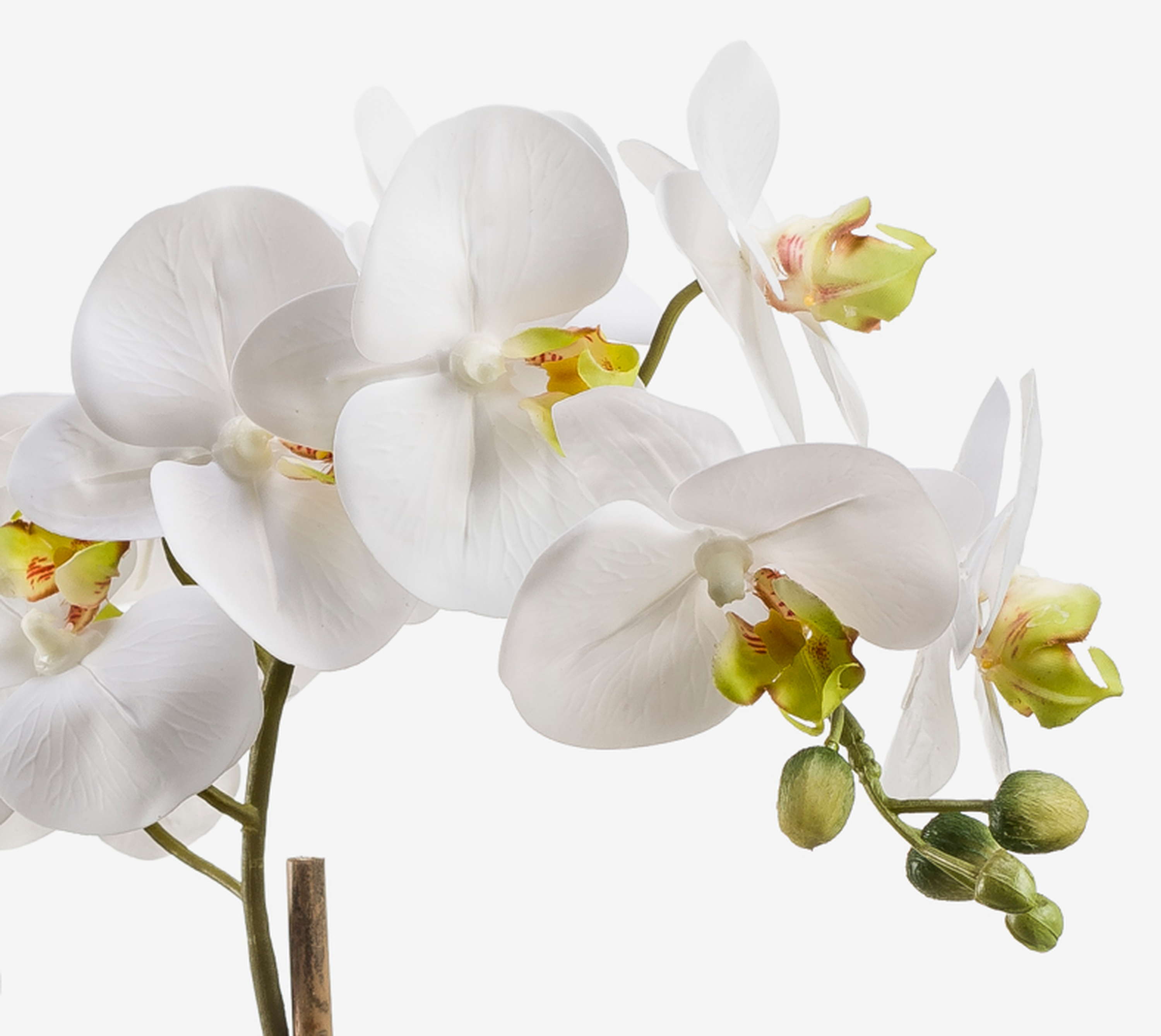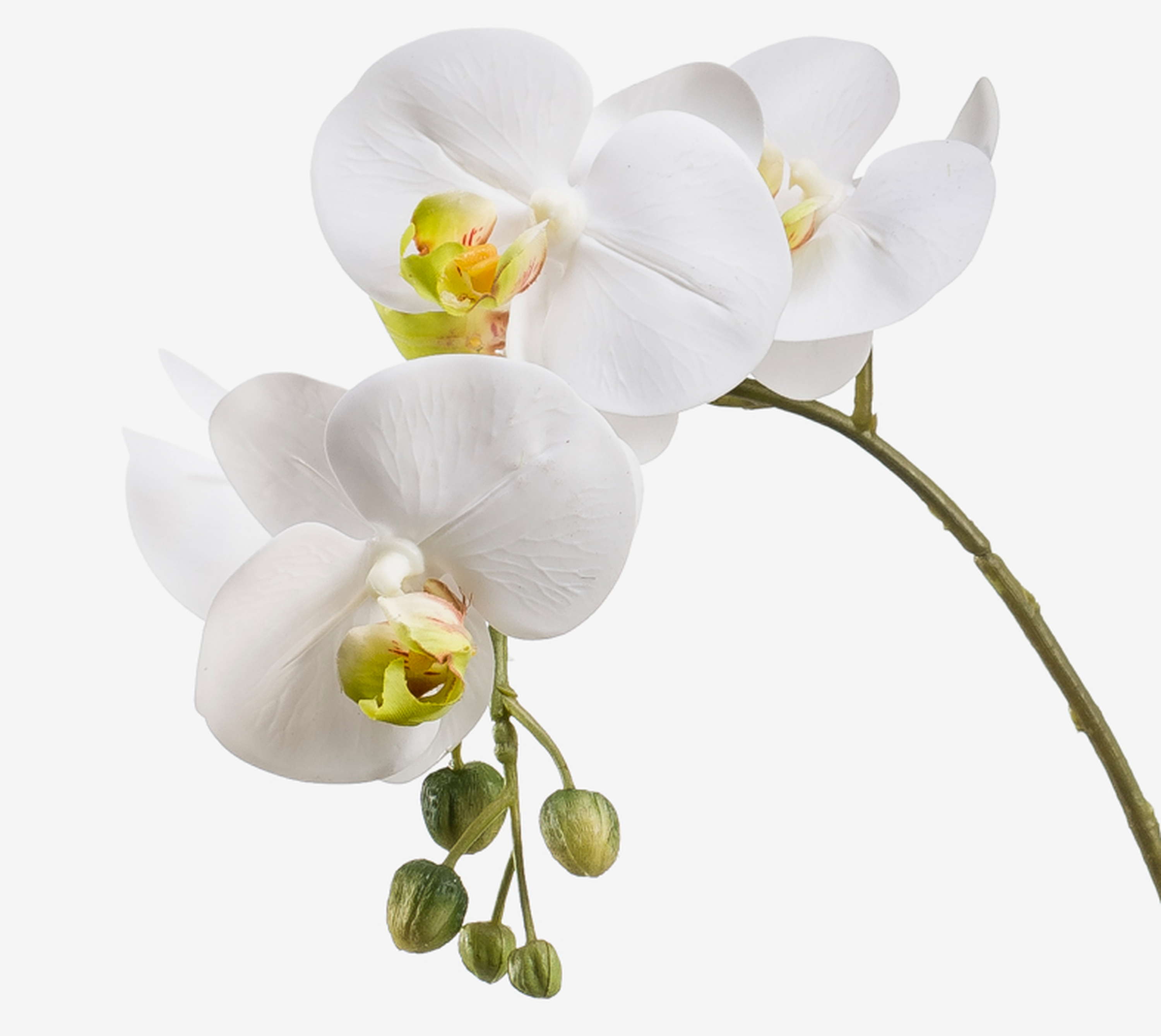 Diese künstliche Phalaenopsis Orchidee CANDIDA mit zwei Blütenrispen in weißgrüner Farbe ist eine geschmackvolle Ergänzung zu ihrer Einrichtung im Wohnzimmer, Schlafzimmer oder Esszimmer.