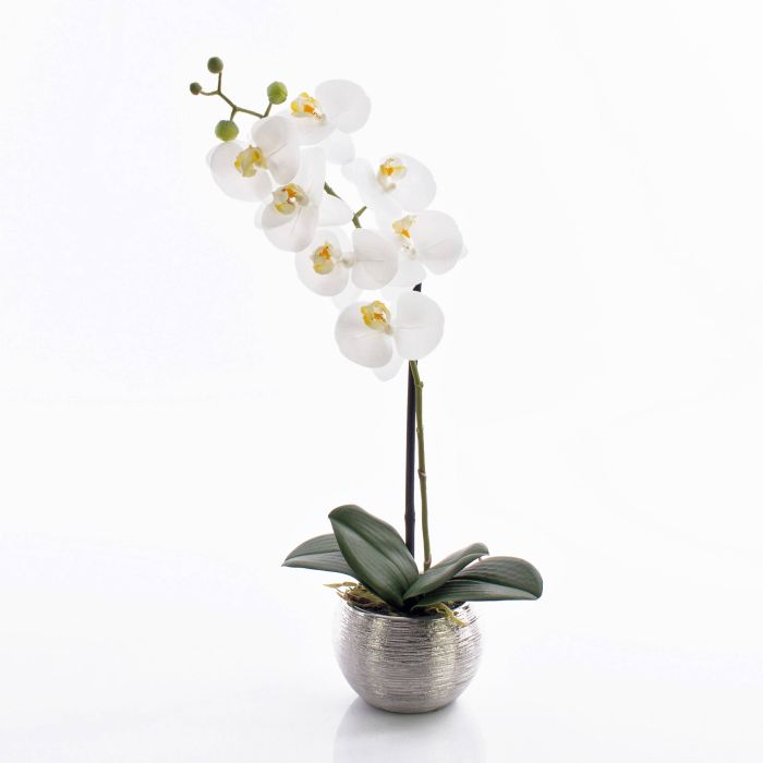 Künstliche Orchidee EMILIA im elegant silber farbigen Topf mit strukturierter Oberfläche. Mit einer Höhe von ca. 45 cm ist die Kunstblume ideal als Geschenk geeignet oder zum dekorieren des Wandregals und vielen weiteren Ideen.