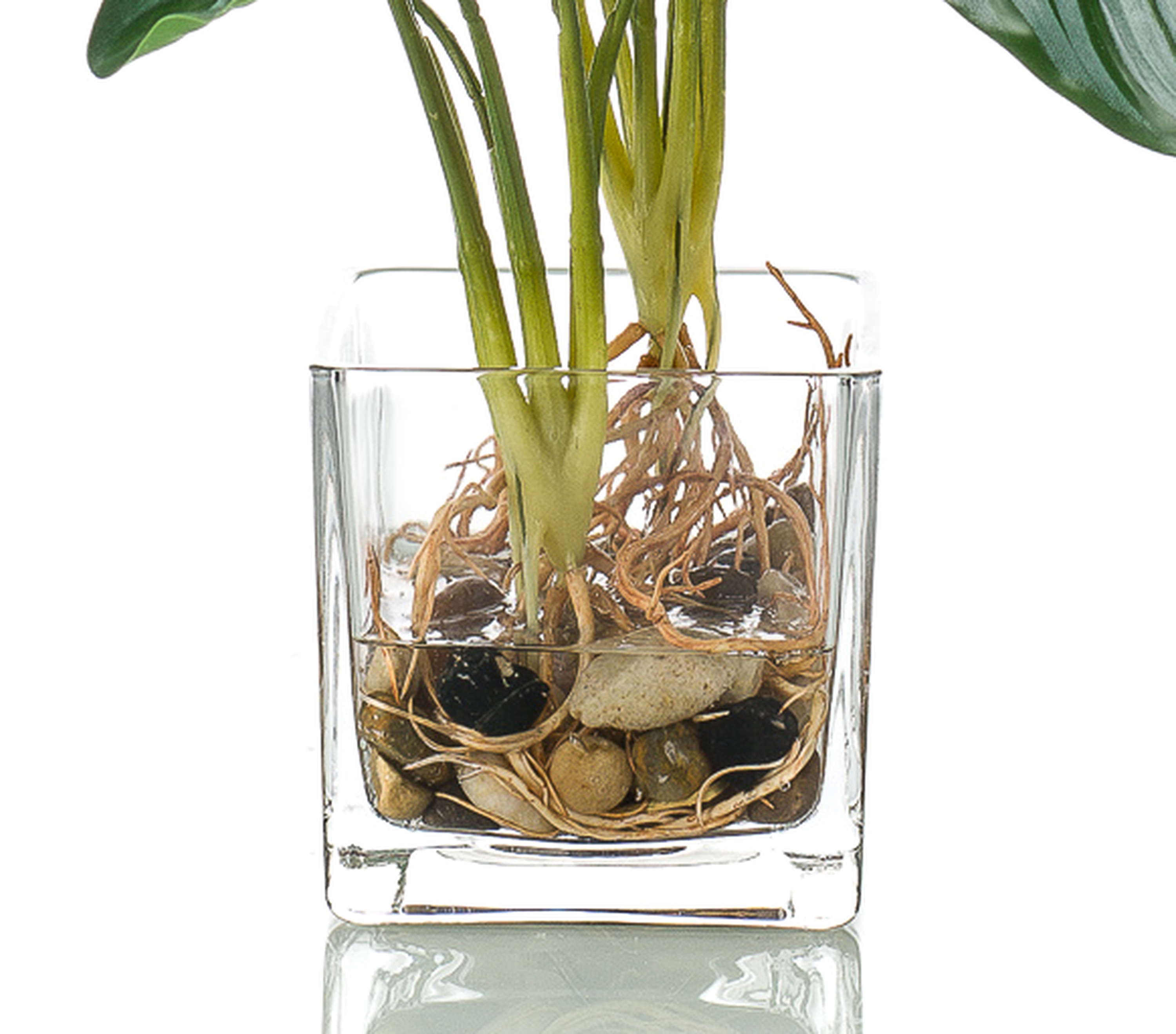 Künstliche Pflanze Calathea Orbifolia AGINA im Deko Glas mit Wurzeln und Kies passt zu jedem Einrichtungsstil und fällt sofort ins Auge.