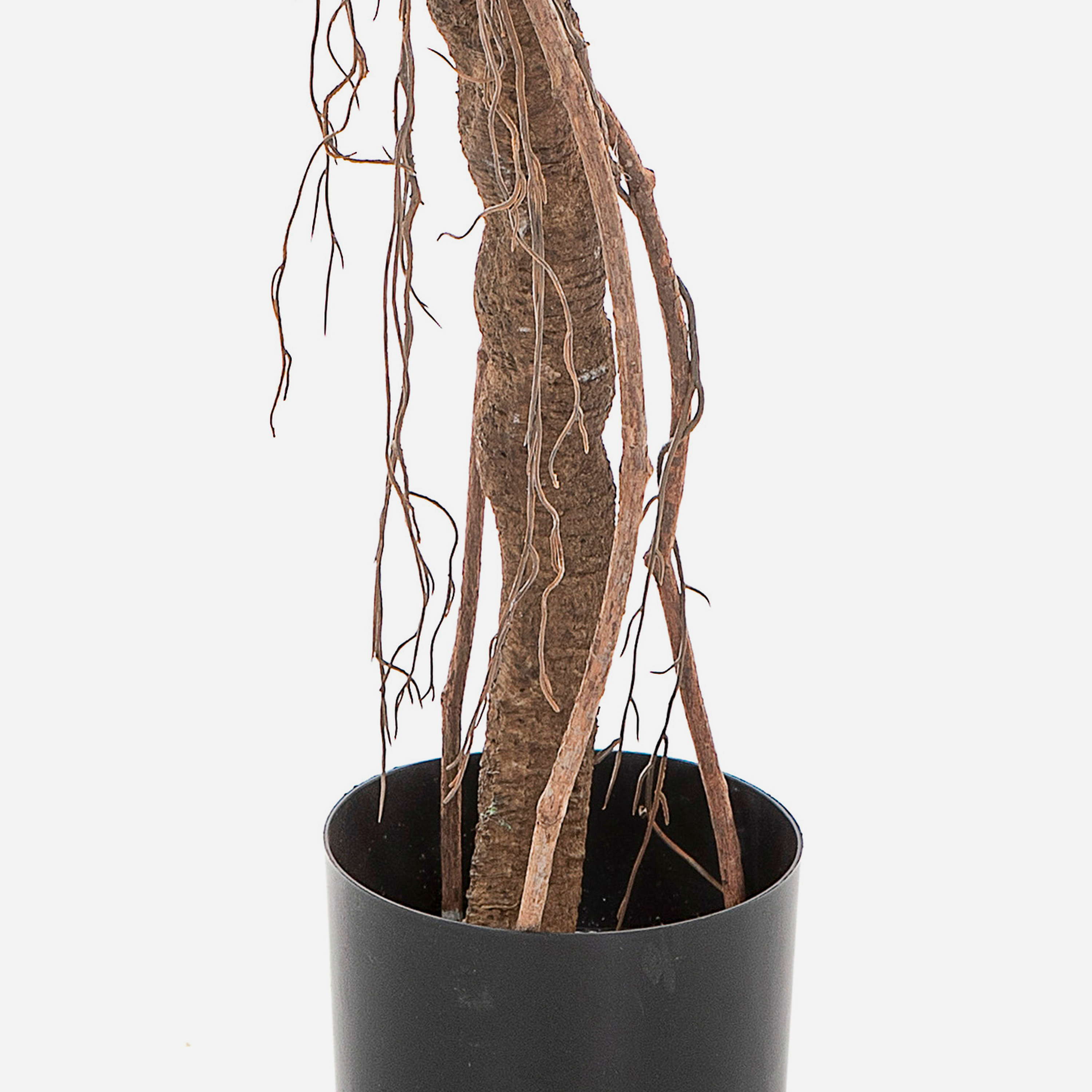 - Die ca. 13 großen geschlitzten Blätter sind an einem realistisch aussehenden Stamm befestigt, mit Luftwurzeln